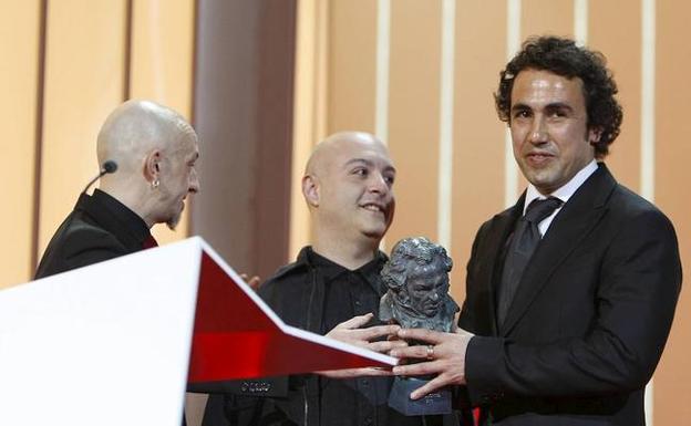 Ángel Loza (i) y otros miembros de su equipo tras recibir el galardón al mejor corto documental por ‘Héroes’ en 2009.