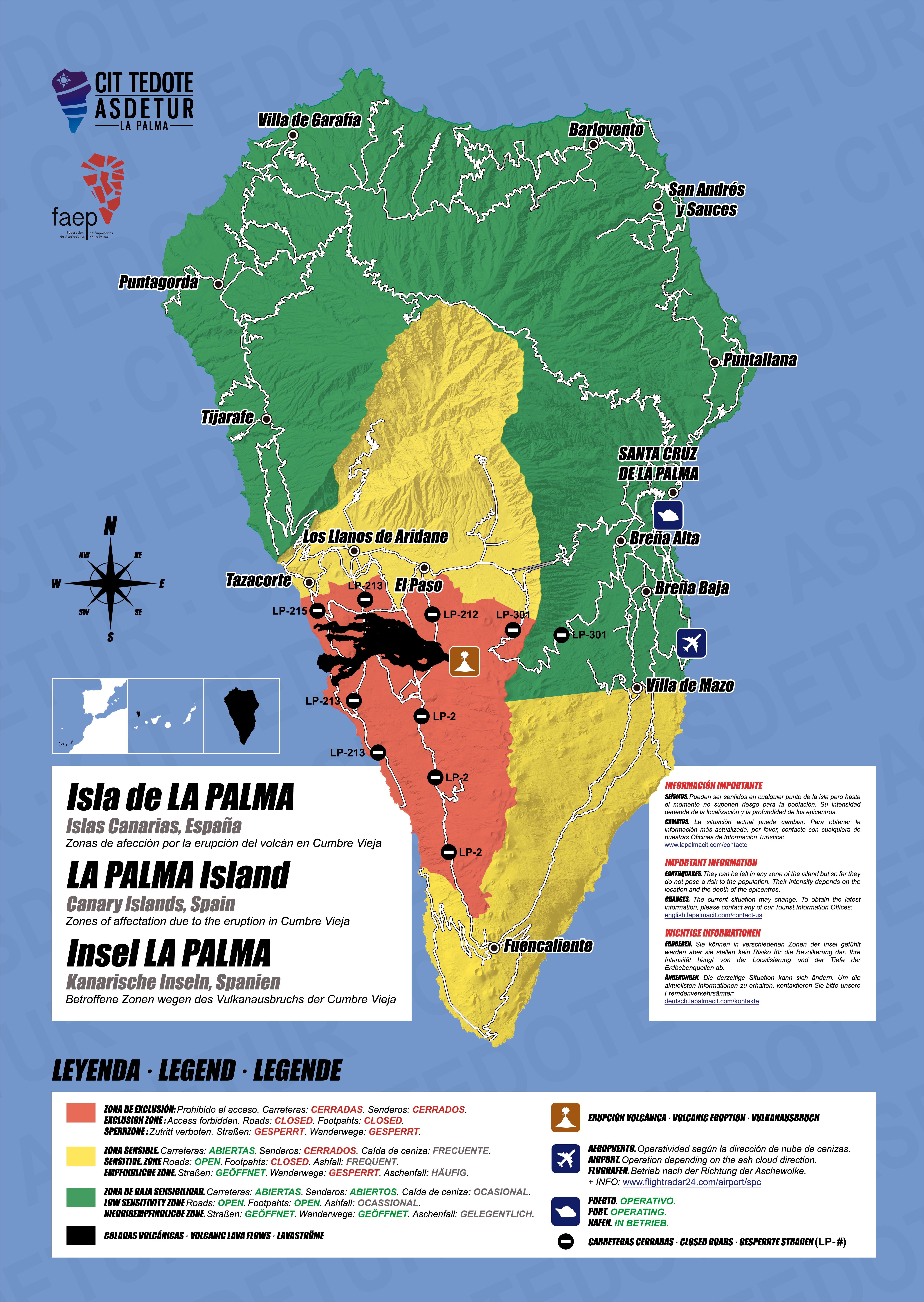 No obstante, y a pesar de que la zona afectada por el volcán es una zona muy pequeña de la isla, la recomendación que estamos dando, hasta el momento, es que no se venga a La Palma porque puede entorpecer las labores de emergencia: por el uso de carreteras, posibles nuevas evacuaciones de otros núcleos poblacionales… Por lo que a los que están, un mensaje de tranquilidad; y los que han de venir, una recomendación de evitarlo de poder ser, puesto que los alojamientos turísticos, actualmente, están completamente llenos (tanto apartamentos turísticos, como casas rurales y hoteles) ocupados por las más de 6.500 personas que, desgraciadamente, se han visto en la obligación de abandonar sus hogares y por los servicios de seguridad que han llegado desde otras islas (principalmente).