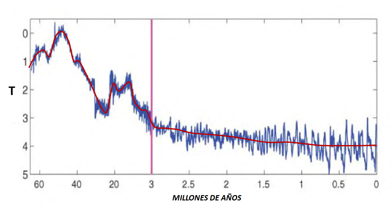 Pero esas diferencias son realmente insignificantes si las comparamos con lo que ocurrió con la evolución de la temperatura del planeta en periodos más antiguos. La figura siguiente representa en color azul la variación de la temperatura registrada durante los últimos 65 millones de años. La forma dentada del gráfico indica la sucesión alternante de periodos cálidos y fríos, mientras que la línea roja traza la tendencia promedio de la evolución térmica. Debe observarse también que la línea rosa vertical marca el límite entre dos diferentes escalas gráficas de representación. Sin ese cambio de escala, si la gráfica continuase con la pauta del periodo comprendido entre 3 y 65 millones de años, el descenso térmico sería mucho más abrupto.