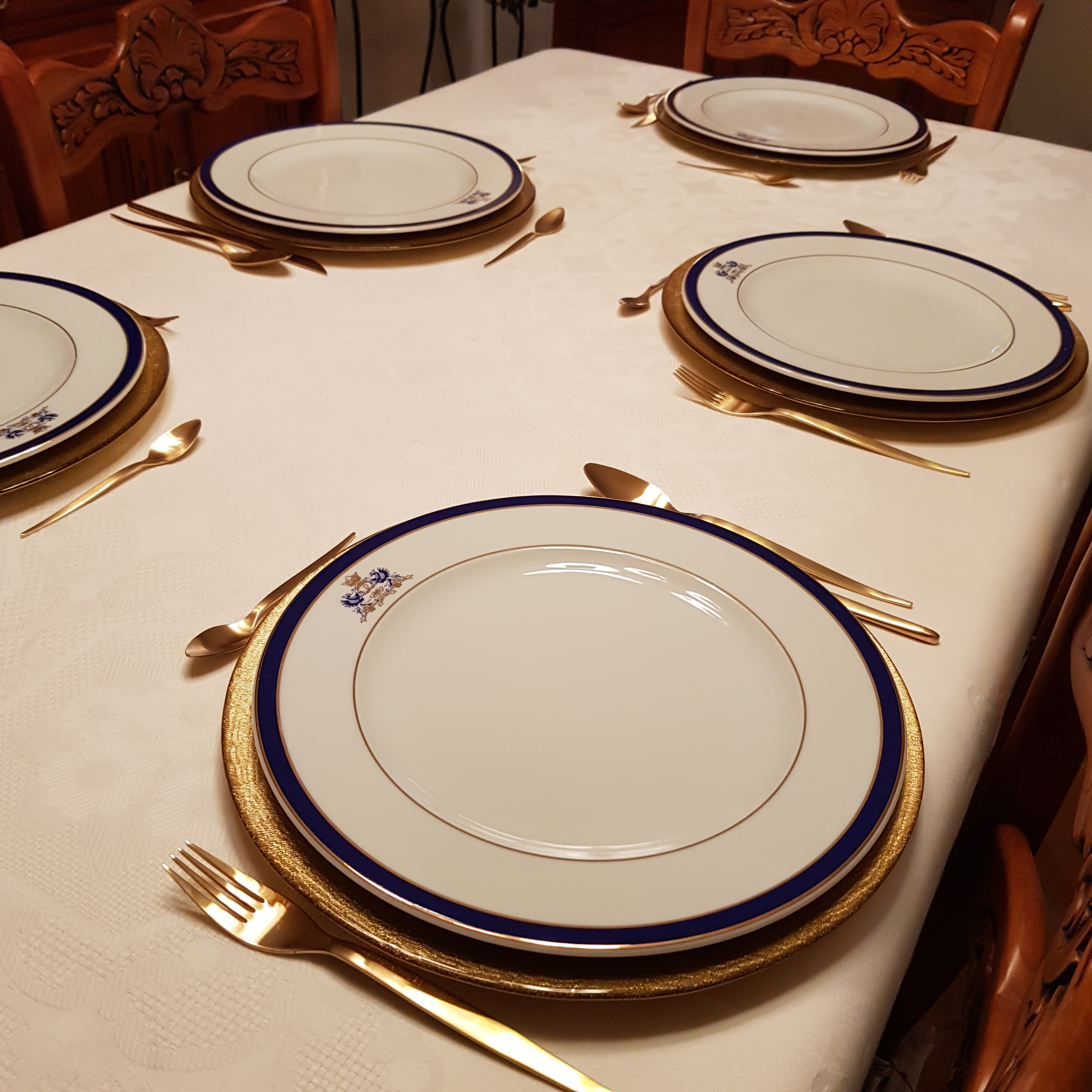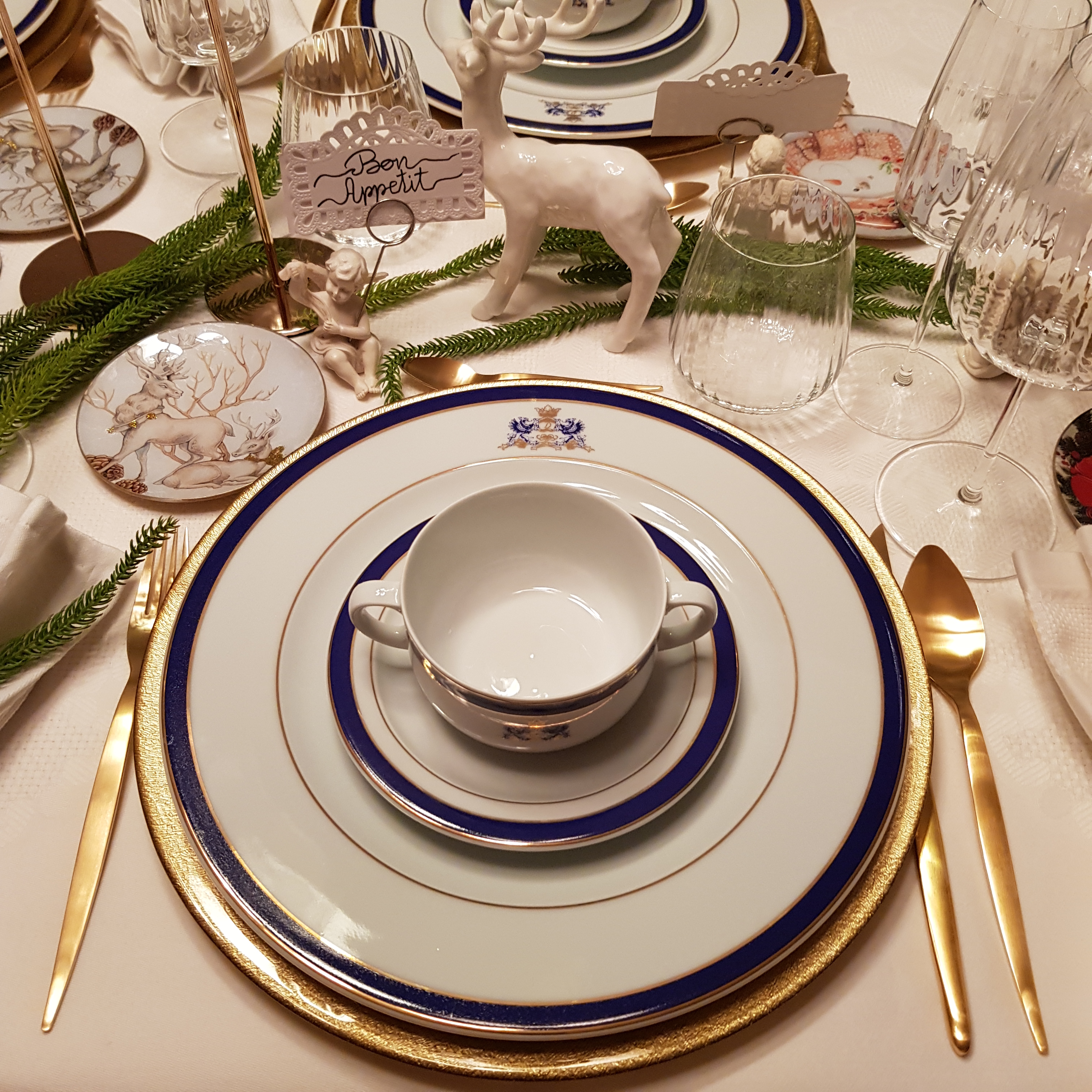 A continuación, los platos y cubiertos. La vajilla es algo muy importante también en una mesa de fiesta. He elegido ésta en blanco y azul cobalto con escudo, de líneas sobrias. Y los cubiertos en color oro en armonía con el resto de la mesa.