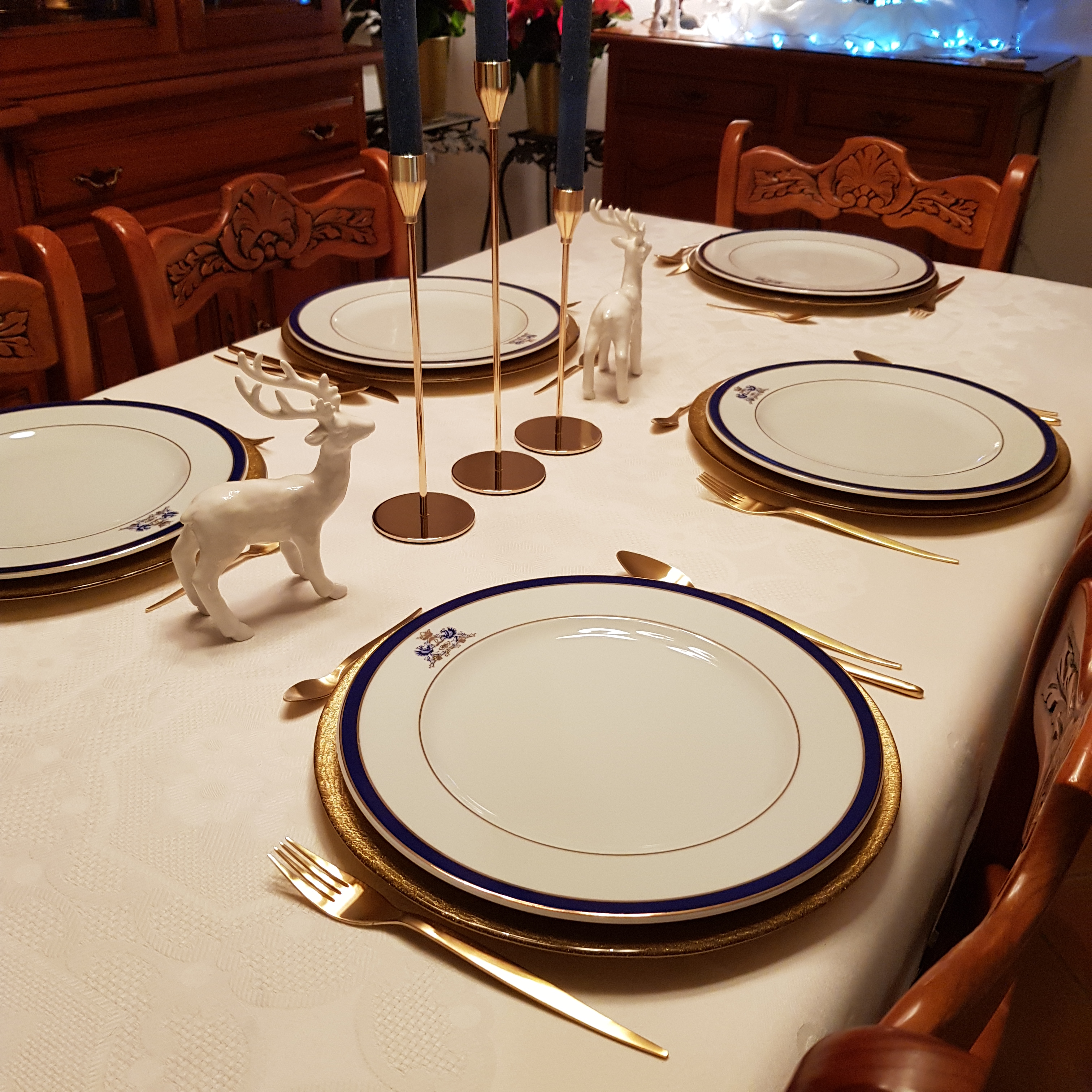 En cuanto al centro de la mesa se pueden colocar adornos navideños como por ejemplo estos ciervos, dándole un toque de distinción ya que va a ser una mesa festiva. Pero también se le podría colocar algo verde (como pino, abeto, acebo, ciprés…..), frutas, plantas como la Flor de Pascua (tan alusiva a estas fiestas) y unas velas que nunca deben falta, sobre todo en Nochebuena.