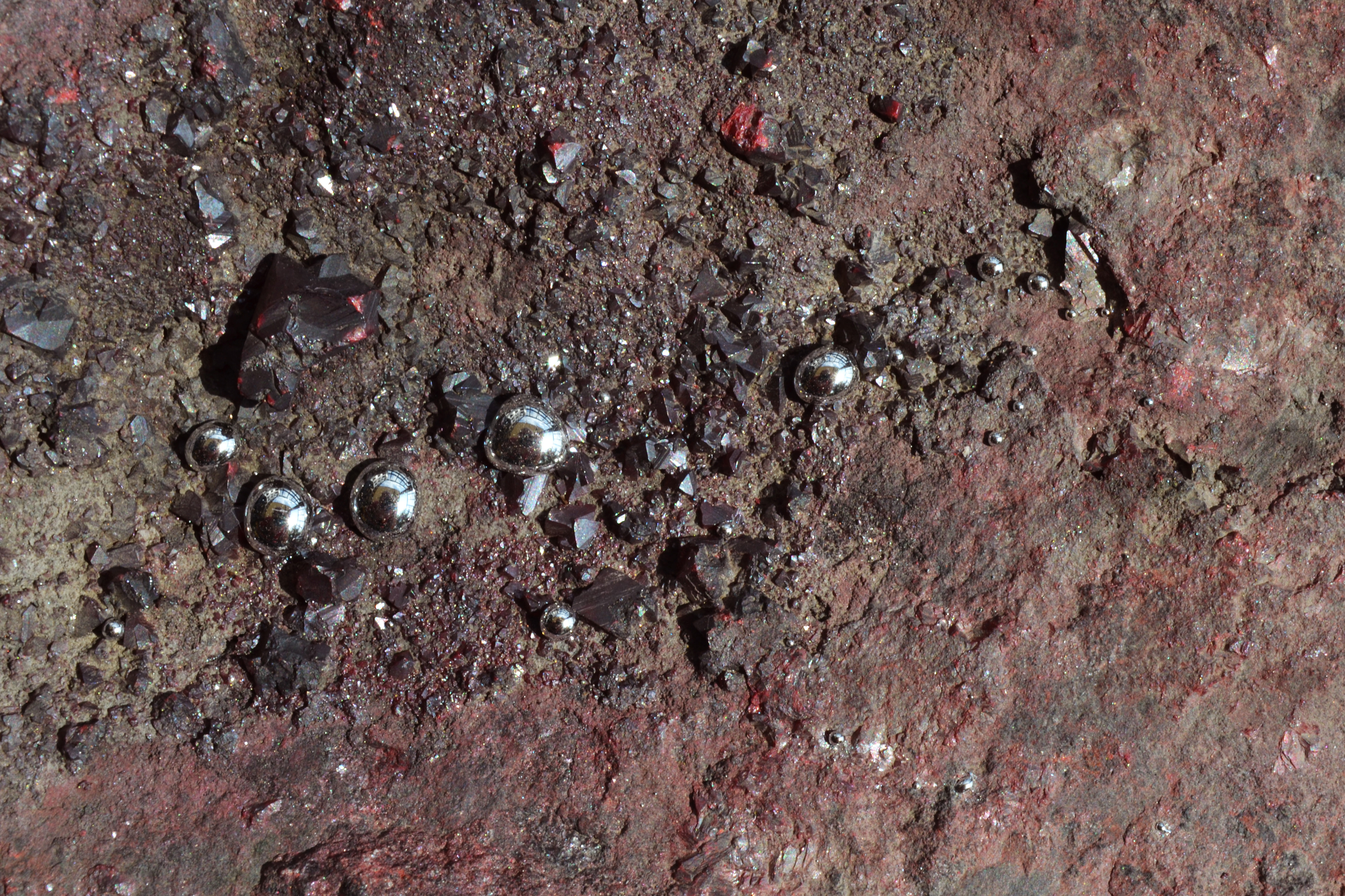 Pero aunque la dilatada trayectoria del yacimiento de Almadén es apasionante, lo que aquí nos interesa, como contrapunto a los presuntos impactos medioambientales del mercurio metálico, es su historia geológica. Hace 435 millones de años, a 45 kilómetros de profundidad, se inició el ascenso de una masa rocosa parcialmente fundida. Cuando llegó a la superficie, en el lugar donde hoy se encuentra Almadén, existía un mar tropical, tranquilo y poco profundo, en cuyo fondo se formó un cráter volcánico, acompañado de emanaciones gaseosas y fuertes explosiones. Algunos de aquellos gases (azufre y mercurio) se combinaron entre sí para formar el cinabrio (sulfuro de mercurio también conocido como bermellón), que rellenó los huecos entre los granos de arena del fondo marino, del mismo modo (aunque mucho más despacio) que el agua ocupa los poros entre los granos de arena de la playa cuando una ola se retira.