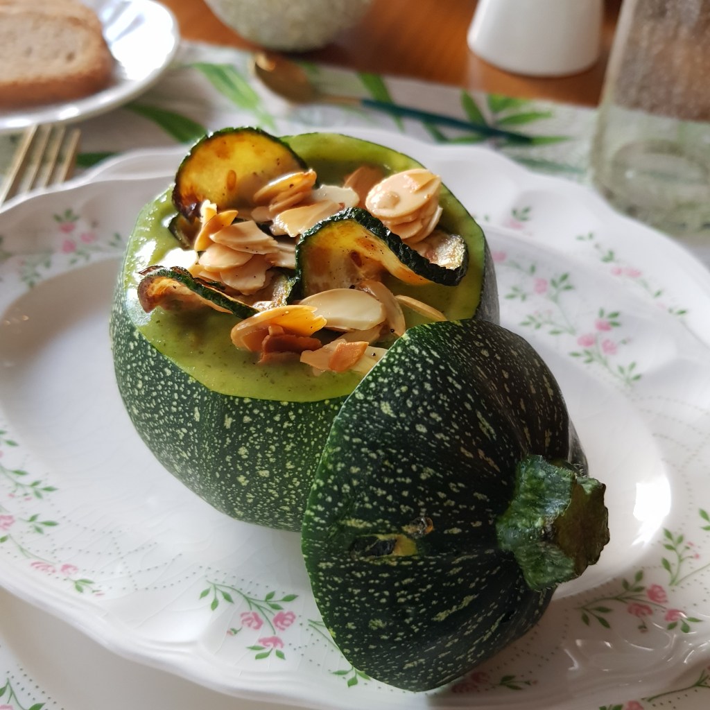 Para esta deliciosa crema, una buena opción sería presentarla en calabacines enanos, ya que como se suele decir, la comida entra por la vista. Y para una bonita presentación se espolvoreará con almendra fileteada, bien sea frita o tostada, y unas láminas de calabacín muy finas que se habrán hecho a la plancha o en forma de chip.