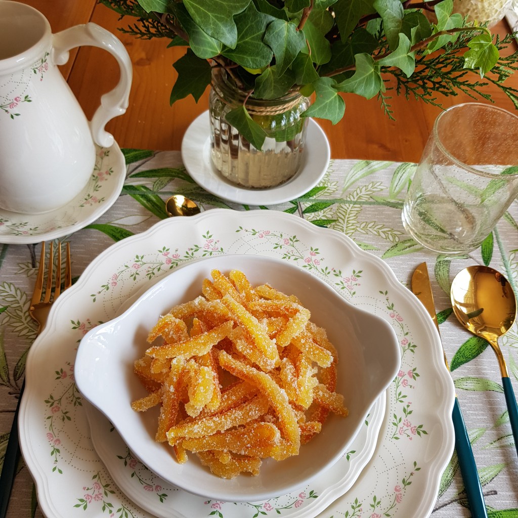Disolver con 250 ml de agua el azúcar a fuego bajo, llevando a ebullición formando un almíbar al que introduciremos las cáscaras de naranja ya escaldadas y dejaremos hervir 1h o un poco más a fuego lento. Pasado este tiempo, dejaremos entibiar las tiras en el almíbar y pasaremos a escurrirlas sobre rejilla.