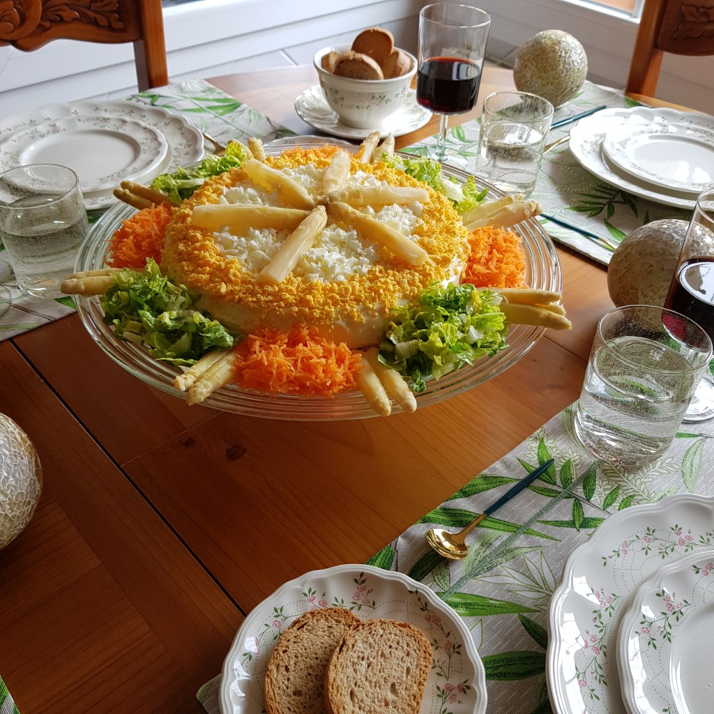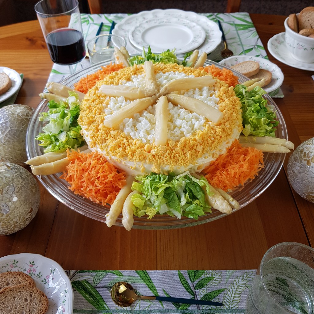 Como podéis ver, los colores son importantes, esa combinación del verde de la lechuga, el naranja de la zanahoria, con el amarillo del huevo y sus deliciosos espárragos le proporcionan un atractivo que ya se desea comer tan solo mirándolo.