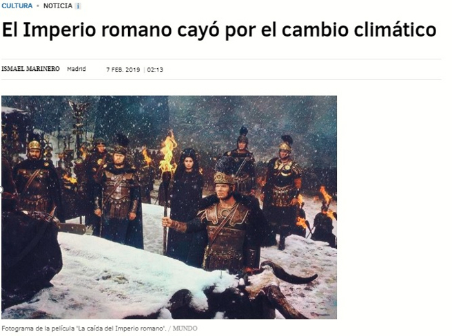Incluso, hay ocasiones en que los datos obtenidos en los últimos años sobre el cambio climático permiten reescribir la historia. A la gente de mi generación nos enseñaron en el colegio que los responsable de la caída del Imperio Romano fueron los pueblos bárbaros, que llegaron desde el Norte y el Este. Sin embargo, el jueves 7 de febrero de 2019, el periódico El Mundo publicaba una información, basada en las investigaciones del historiador Kyle Harper, manifestando que fue el cambio climático, en este caso un periodo muy frio entre los años 536 y 547 d.C. (subsiguiente a un período muy cálido que se corresponde con la mayor parte del desarrollo histórico de la República y el Imperio Romano), quien desestabilizó aquella todopoderosa civilización. Lo cual permite confirmar de paso, que las alternancias de periodos cálidos y fríos, sin ayuda de la sociedad industrial, se vienen sucediendo desde tiempos inmemoriales e incluso históricos.