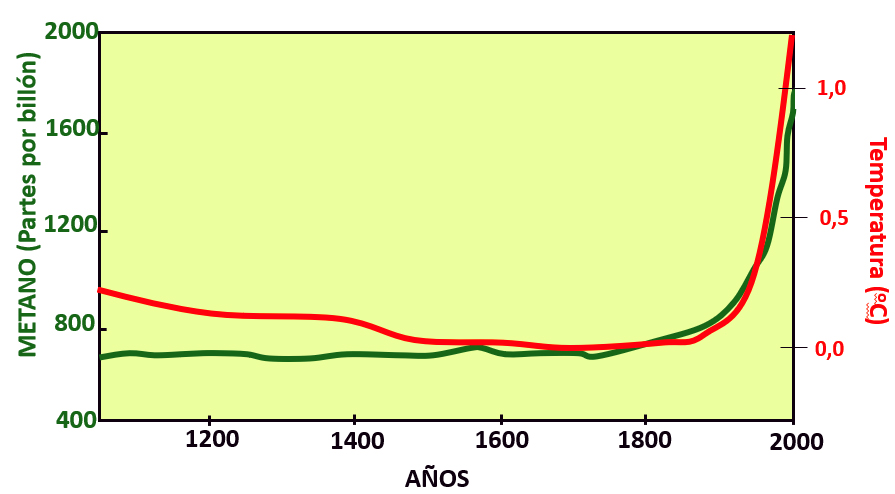 En la figura anterior, la línea verde representa la evolución del contenido de metano en la atmósfera durante el último milenio (según los datos publicados por Etheridge et al. en 1998) y la línea roja corresponde a la evolución de la temperatura durante ese mismo periodo, de acuerdo con las publicaciones del Grupo de Estudios sobre el Cambio Climático promovido por la ONU, el IPCC. El paralelismo (especialmente a partir del siglo XVI) entre ambas líneas, sugiere que debe haber una estrecha relación entre ambos procesos, lo cual tampoco debería extrañarnos si tenemos en cuenta que al aumentar la temperatura aumente también la evaporación y el deshielo. Es lógico por lo tanto que, a medida que el planeta se va calentando, crezca el contenido de metano en la atmósfera proveniente de humedales y zonas de permafrost descongeladas.