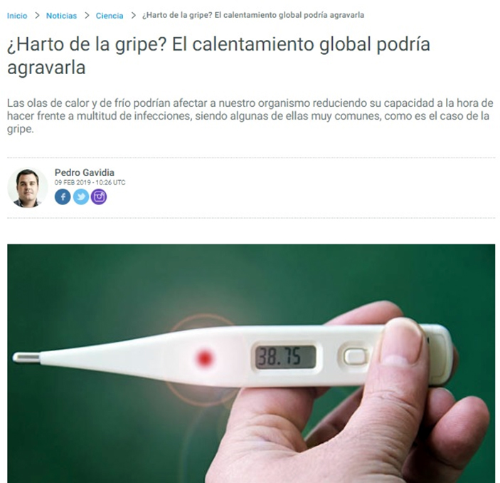 Tampoco deben olvidarse las implicaciones que el cambio climático puede tener para la salud humana, ya que los efectos de enfermedades estacionales como la gripe, que nos visita puntualmente cada invierno, podrían verse agravadas como consecuencia del calentamiento global, reduciendo la capacidad del organismo para combatir ese tipo de infecciones. A pesar de que soy totalmente lego en temas médicos, no deja de sorprenderme esta afirmación. Teniendo en cuenta que la gripe es una dolencia estacional que aparece durante el periodo invernal (al menos, eso nos han dicho siempre), el calentamiento debería contribuir a disminuir los efectos de la enfermedad, no a potenciarlos.