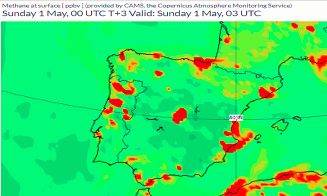 Una clara evidencia de esa insignificancia la aportan los datos que periódicamente obtiene el satélite SENTINEL, dentro del programa COPERNICUS, que mide (entre otros parámetros) el contenido de metano en la atmósfera. En la imagen siguiente, coloreadas en rojo, pueden observarse las zonas de máxima concentración de metano en la península ibérica, que coinciden con exactitud sobre las áreas urbanas e industriales, siendo nulas las concentraciones apreciables en áreas rurales típicamente ganaderas.