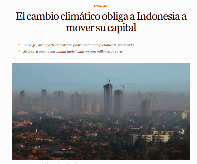 En otras ocasiones, se llevan al límite los argumentos, distorsionando la realidad y ocultando las verdaderas causas de determinados fenómenos, con el objeto de atribuir arbitrariamente al calentamiento global, problemas que en realidad son ajenos a él. Este ha sido el caso de Yakarta, la capital de Indonesia, una de las ciudades más castigadas del mundo por la contaminación, que además sufre un problema de subsidencia (hundimiento), como consecuencia de la sobreexplotación de los acuíferos situados bajo ella. Es decir, que no solamente está siendo afectada por la subida del nivel del mar como todas las ciudades costeras del mundo, sino que es la ciudad la que se está hundiendo. Sin embargo, obviando esa realidad, las informaciones aparecidas en la mayor parte de los medios de comunicación, atribuyen los problemas de Yakarta al cambio climático, como se puede ver en el titular adjunto, publicado en El Economista el pasado 6 de febrero de 2022. Es rigurosamente cierto que el gobierno indonesio ha decido abordar una inversión astronómica para desplazar su capital hasta otro emplazamiento, pero es falso que dicha decisión tenga como causa el calentamiento global.