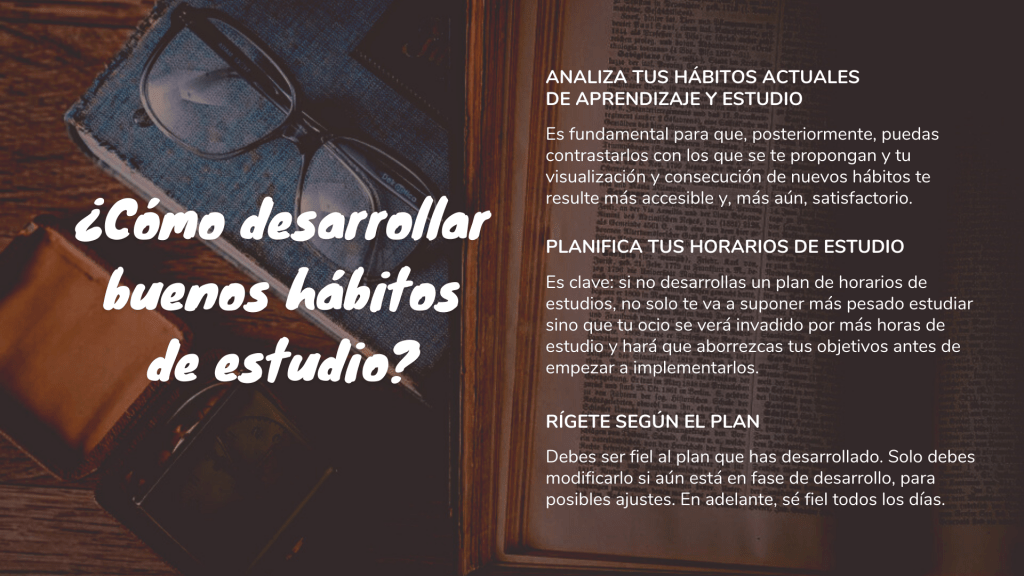 Es fundamental que analices tus hábitos actuales de aprendizaje y de estudio para que, posteriormente, puedas contrastarlos con los que se te propongan y para que tu visualización y consecución de nuevos hábitos te resulte más accesible y, sobre todo, una experiencia más satisfactoria.