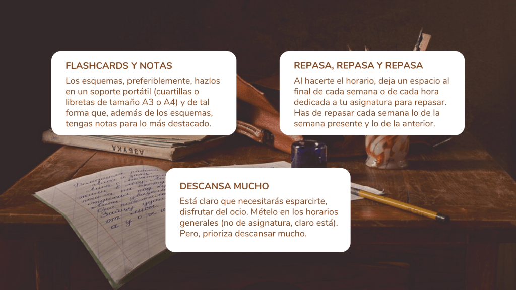 Está claro que necesitarás esparcirte, disfrutar del ocio (sin duda, para tu salud mental esto es básico, sea el ocio que sea). Mételo en los horarios generales (no de asignatura, of course). Pero, prioriza descansar en diferentes maneras y mucho: el mero hecho de alejarte a la hora de estudiar hará que sientas cierto descanso mientras estudias. Dormir es fundamental, así que procura irte a dormir antes que después y de forma regular. Si te despiertas pronto, mejor que si estiras por la noche. Pero, si no te funciona al probarlo, siempre puedes hacer lo contrario. En todo caso, descansar es una de tus prioridades.