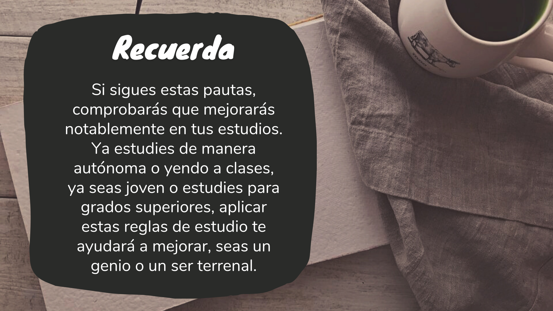 Si sigues estas pautas, comprobarás que mejorarás notablemente en tus estudios. Ya estudies de manera autónoma o yendo a clases, ya seas joven o estudies para grados superiores… aplicar estas reglas de estudio te ayudará a mejorar, seas un genio o un ser de lo más terrenal. La excelencia se consigue siendo serio con las mejores pautas.