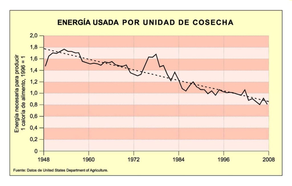 Por otro lado, este aumento de productividad ha ido asociado con mejoras en la eficiencia energética que se traduce en un menor consumo de energía por unidad alimentaria producida. Cada vez se han ido produciendo más alimentos por unidad de terreno cultivable, y además, con gasto de energía menor, tal y como se recoge en la Figura 2 gracias a la mejora de las semillas transgénicas y al eficiente desarrollo de las técnicas agrícolas.