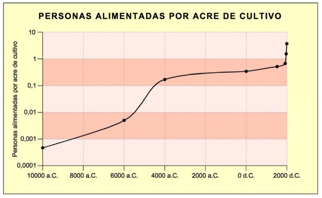Un aspecto clave para que se haya podido alcanzar el actual grado de desarrollo humano ha sido la capacidad de alimentar a una población creciente, que empezó el siglo XX con unos 1.700 millones de personas y ha llegado a los 8.000 millones actuales (según recientes informaciones de la O.N.U.), estimándose que se alcanzará la cifra de unos 9.500 millones de habitantes para el año 2050. Para conseguirlo, se ha aumentado de forma drástica la productividad de los cultivos y de la ganadería, manteniendo estabilizado o en un crecimiento bajo, la cantidad de hectáreas de terreno que se dedican a la producción de alimentos. Este incremento de la productividad, realmente espectacular durante el siglo XX, está gráficamente representado en la Figura 1, donde se puede apreciar la fulgurante evolución reciente del número de personas que pueden ser alimentadas por los cultivos realizados en un acre de terreno (un acre es algo menos de media hectárea). Dicho crecimiento ha sido sin duda posible gracias a la creatividad y conocimiento de los seres humanos, pero también a la disponibilidad de hidrocarburos para fabricar fertilizantes, tan denostados últimamente.