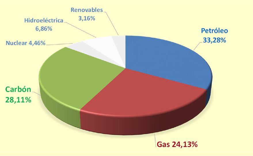 Las energías renovables (solar y eólica) son un porcentaje muy pequeño del total y la dependencia de los combustibles fósiles es muy grande.