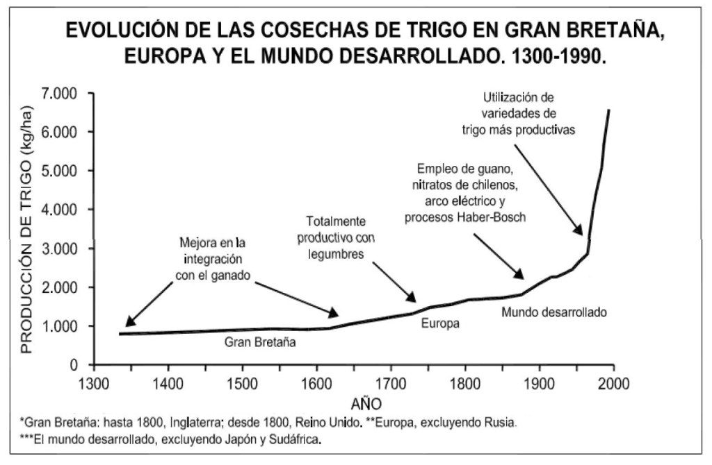 A modo de ejemplo, la Figura 3 ilustra el impacto en productividad (toneladas de grano por hectárea) que ha tenido la utilización de nuevas variedades de trigo en Gran Bretaña. Y no debe olvidarse que, a nivel mundial, los hidrocarburos han tenido mucho que ver en esa revolución verde, ya que el incremento de la productividad agrícola se podido alcanzar gracias a la producción de fertilizantes, a la energía que se necesita para su fabricación y a la maquinaria agrícola movida por ellos.