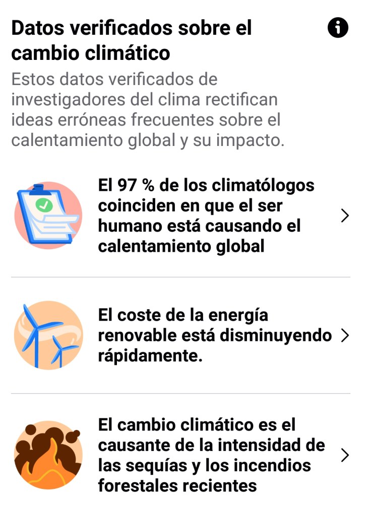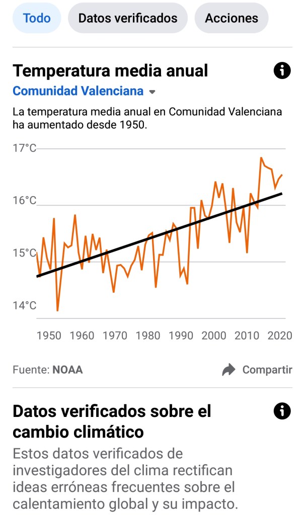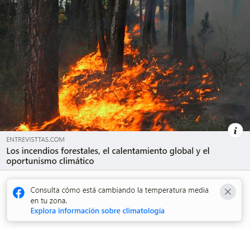 Pero pronto pude darme cuenta, también, que no todo era satisfactorio en el mundo digital. Cuando a través de mi perfil, publicaba el enlace para acceder al contenido del artículo, si en el título se mencionaba el calentamiento global o el cambio climático, automáticamente aparecía un mensaje, una alerta como la que puede observarse en la captura de pantalla que se adjunta (Figura 1), indicando al lector: Consulta cómo está cambiando la temperatura media en tu zona. Explora información sobre climatología. Si quien está leyendo ahora mismo este texto, ha accedido al mismo a través de Facebook, siguiendo un enlace a Entrevisttas.com, es muy probable que se haya encontrado ya con dicho mensaje en su pantalla.