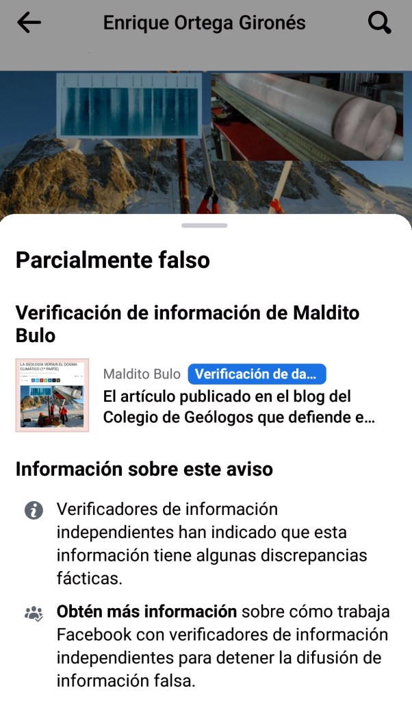 En la misma línea que los mensajes admonitorios comentados en párrafos anteriores, las críticas publicadas en la prensa, han tenido su impacto en las redes sociales. Así, al insertar en mi perfil de Facebook el enlace para acceder a la primera parte del artículo, en la página web del Colegio de Geólogos, aparece otro mensaje, aún más severo (ver Figura 4), advirtiendo que según verificadores independientes, el artículo contiene información parcialmente falsa.