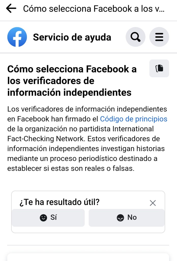 Haciendo clic de nuevo en la parte inferior de la Figura 5, se accede a más información sobre cómo trabaja la red social para detener la difusión de informaciones falsas, gracias una nueva pantalla donde, con toda transparencia, se aclara que los verificadores de información independientes investigan historias mediante un proceso periodístico destinado a establecer si estas son reales o falsas (Figura 6).
