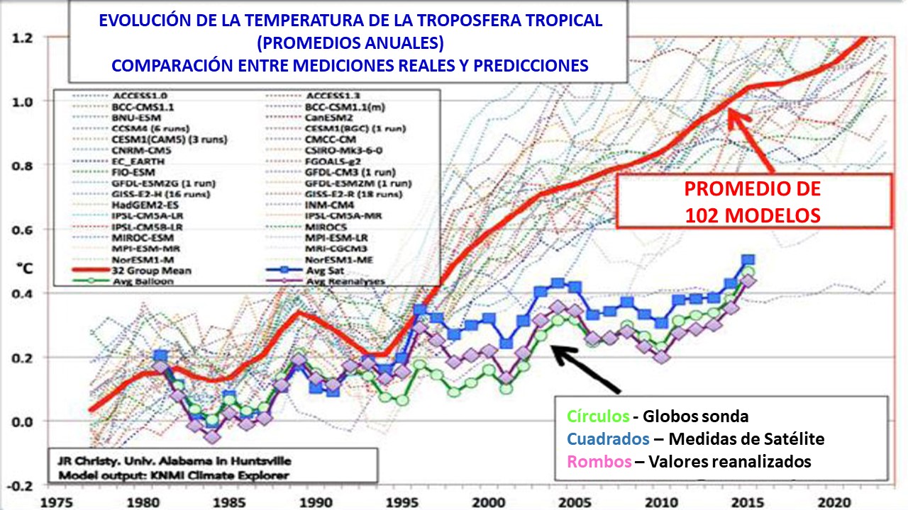 En la gráfica adjunta (ver Figura 7), presentada por el astrofísico J.R. Christy en 2016, al Comité de Ciencia, Espacio y Tecnología de los Estados Unidos, se comparan las temperaturas reales medidas y las predicciones realizadas por modelos estadísticos, durante el periodo comprendido entre 1975 y 2015. La gráfica muestra como ninguna de las previsiones realizadas se ha aproximado a los datos reales , a la realidad observada, ya que durante los últimos 40 años la temperatura ha aumentado tan sólo 0,3ºC.