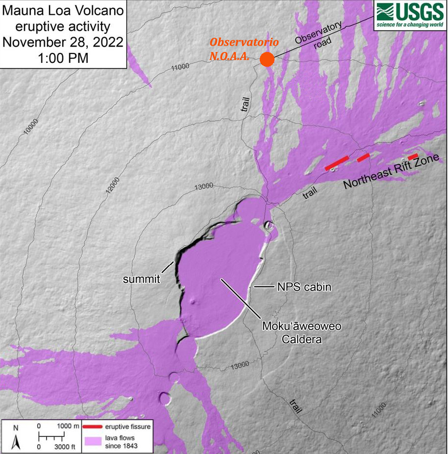 El observatorio N.O.A.A. se sitúa a unos 2.500 m al Noroeste de la actual erupción.