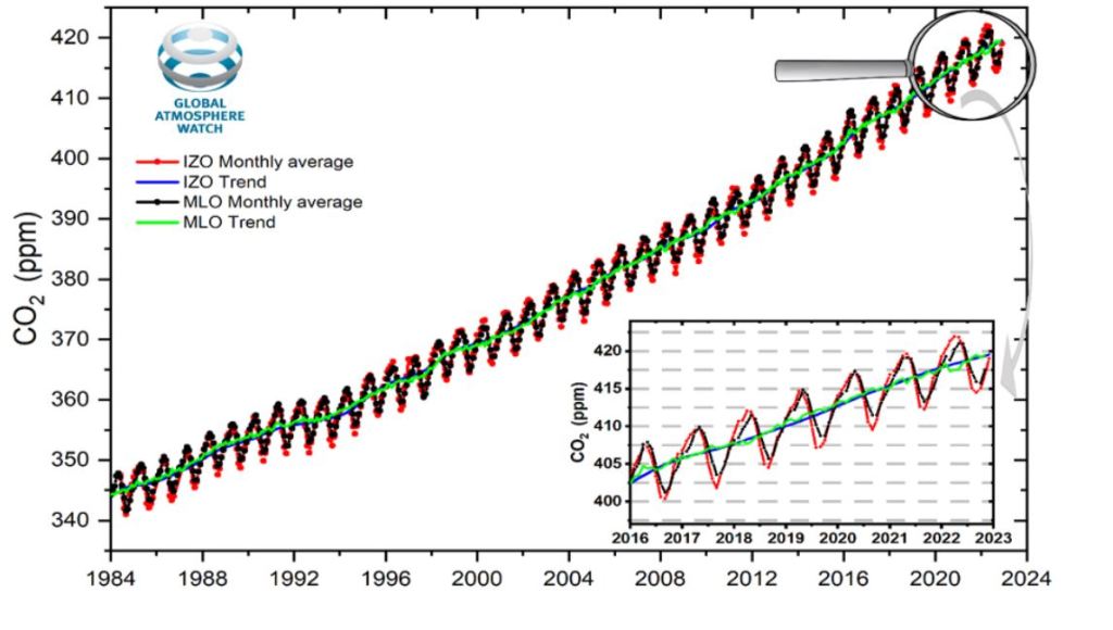 Afortunadamente, además de las medidas de Mauna Loa, existen otros observatorios a escala global que realizan medidas de CO2, por lo que la continuidad de los datos está asegurada. Uno de ellos es, el Centro de Investigación Atmosférica de Izaña, perteneciente a la Agencia Española de Meteorología (AEMET), un emplazamiento que presenta muchas similitudes con el Observatorio de Mauna Loa. En efecto, también dedicado a medir los gases atmosféricos, está situado en una posición oceánica, la isla canaria de Tenerife (relativamente cercana, eso sí, al desierto del Sahara), muy cerca de la cumbre del volcán más grande de España (Teide), a una altura de 2.367 metros, cerca de áreas afectadas por erupciones recientes. Cuando en 2021 se produjo la erupción del volcán de La Palma, a 140 km de distancia, la investigadora Omaira García Rodríguez señaló que se registraron incrementos de hasta 75 partes por millón (ppm) de forma puntual cuando la nube de dispersión volcánica impactó el observatorio, valor que supone casi 10 veces la variación estacional de nuestra región (8 ppm), y casi 40 veces la tendencia de crecimiento interanual global de aproximadamente 2 ppm. En la misma línea, la investigadora subrayó que: A escala local o regional y durante periodos muy cortos de tiempo, las concentraciones de COobservadas sí se pueden modificar de una forma apreciable debido a las contribuciones de las emisiones volcánicas. En la figura 5, se recogen los datos de la gráfica de Keeling del observatorio de Izaña y su comparación con los obtenidos en Mauna Loa. Aunque los datos presentan pequeñas diferencias, las curvas en general son muy parejas por lo que la continuidad de la serie de datos está asegurada. Las ligeras variaciones entre los dos observatorios pueden verse en los datos recogidos en la Tabla 1.