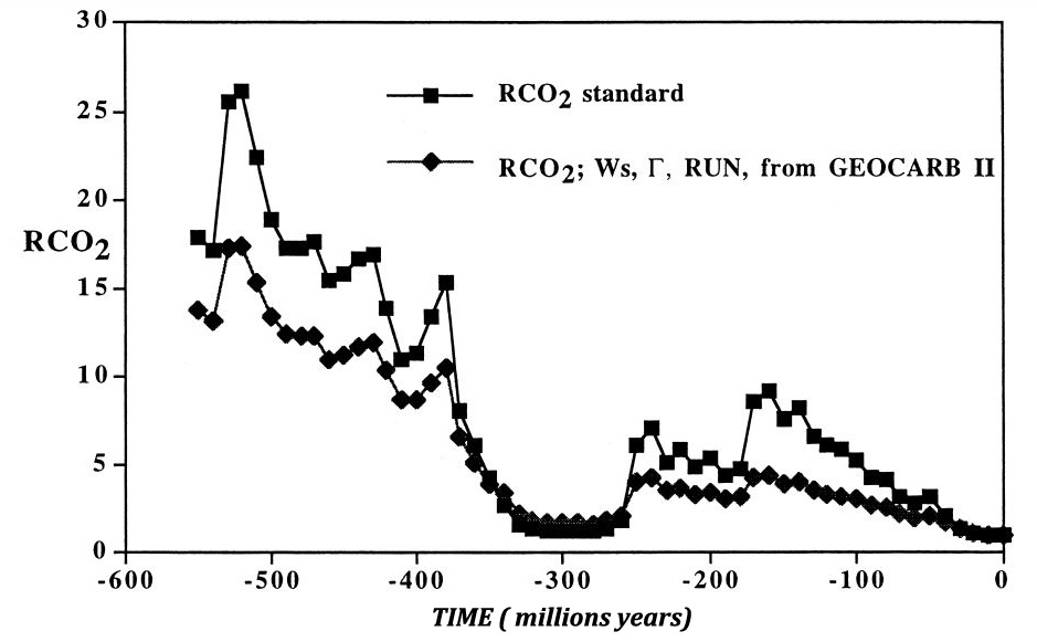 Así, en la Figura 8, obtenida de los trabajos de Berner & Kothavala (2001), se representa la evolución durante los últimos 600 millones de años (desde el inicio del Paleozoico) del contenido de CO2 en la atmósfera. Los valores de ordenadas se corresponden con un factor multiplicativo de la masa de CO2 respecto a los valores actuales. De acuerdo con el gráfico, en el inicio del período Cámbrico (hace 550 millones de años) el CO2 atmosférico era 25 veces mayor que el actual (unas 10.000 ppm) bajando drásticamente hasta que, entre los 350 y 250 millones de años (períodos Carbonífero y Pérmico), alcanzó valores similares a los actuales con 400 o 500 ppm. Estos valores tan bajos no se han vuelto a dar hasta el presente. No se entiende, por tanto, el porqué ahora es tan peligrosa esta concentración. Hace 250 millones de años (en el triásico inferior), el CO2 volvió a subir hasta las 3.000 ppm y existe otro pico hace 170 millones de años (en el Jurásico Medio) en que el CO2 alcanzó las 4.000 ppm. Desde entonces el mundo ha ido reduciendo progresivamente su contenido de CO2 hasta los valores actuales.