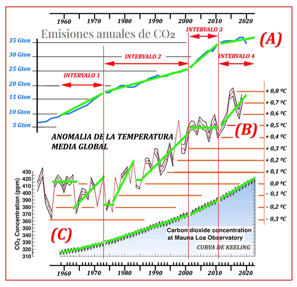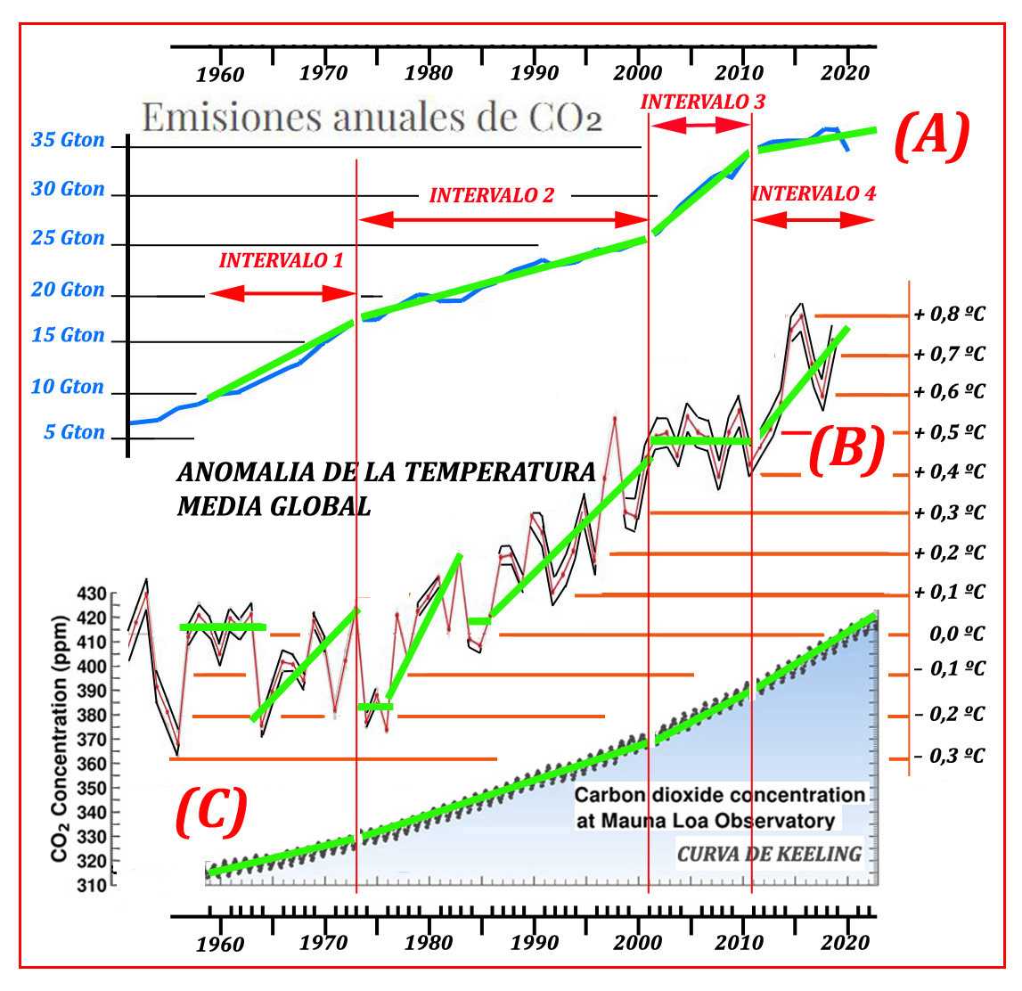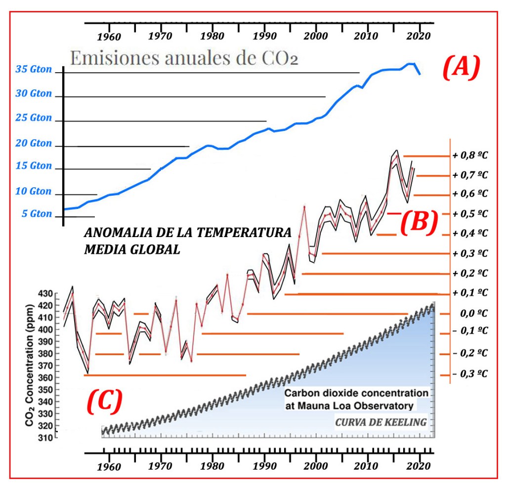 La Figura 9 permite comparar, para el intervalo comprendido entre 1960 y 2022, las emisiones de CO2 a la atmosfera (gráfica A) con el incremento de la temperatura media global (gráfica B) y con la evolución de la concentración media mensual de CO2 medida en el observatorio de Mauna Loa (curva de Keeling, gráfica C). La gráfica B (incremento (∆ ºC) de la temperatura media global para el intervalo 1960-1991) se representa dentro de un intervalo de confianza (las líneas negras por encima y por debajo de la línea roja central), indicativas de que el valor medio puede oscilar entre los valores máximo y mínimo indicados por dichas líneas negras.