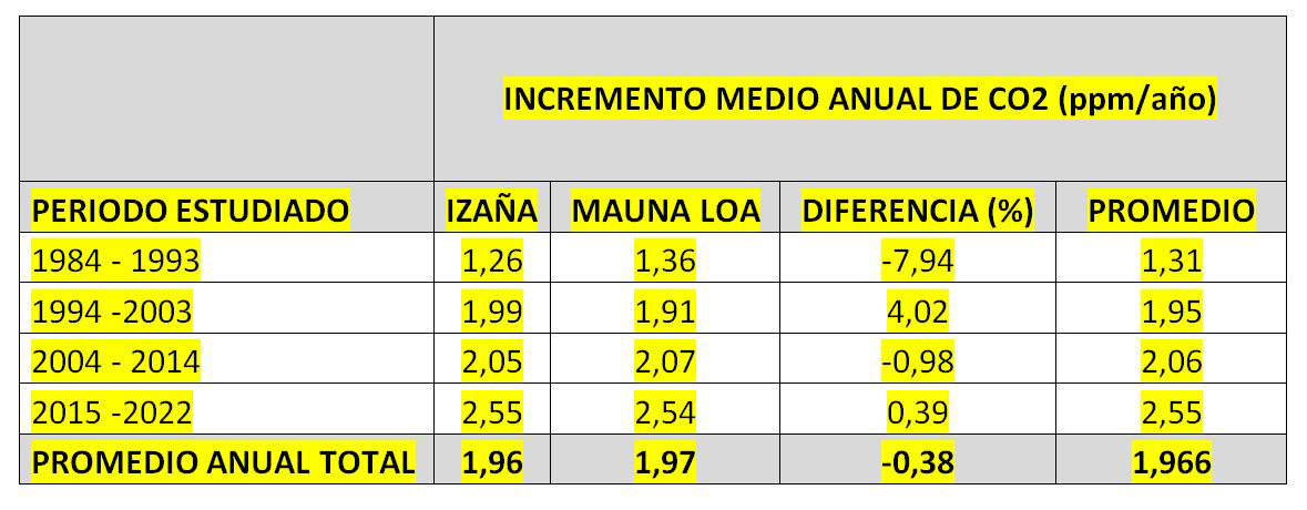 Tabla 1. Incremento medio anual de la concentración de fondo de CO2 (ppm/año) en los