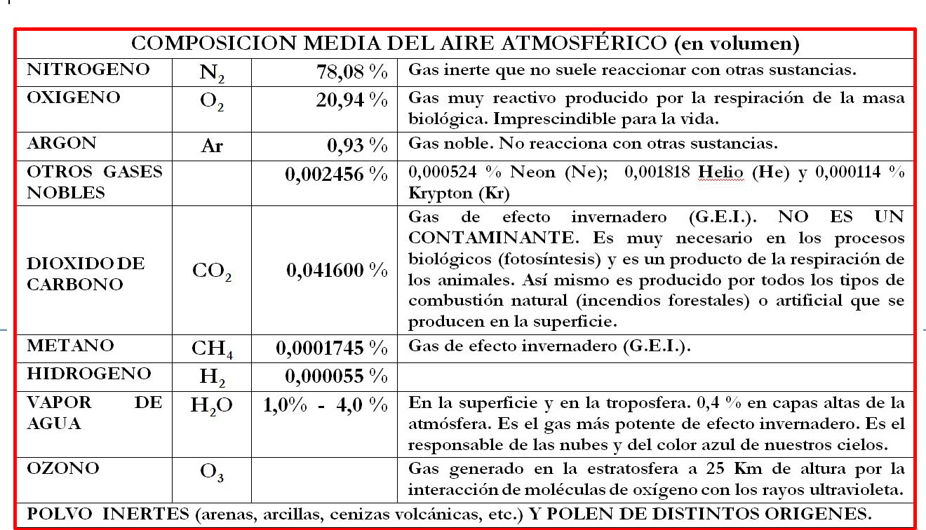 Tabla 2. Composición media del aire atmosférico en 1987.