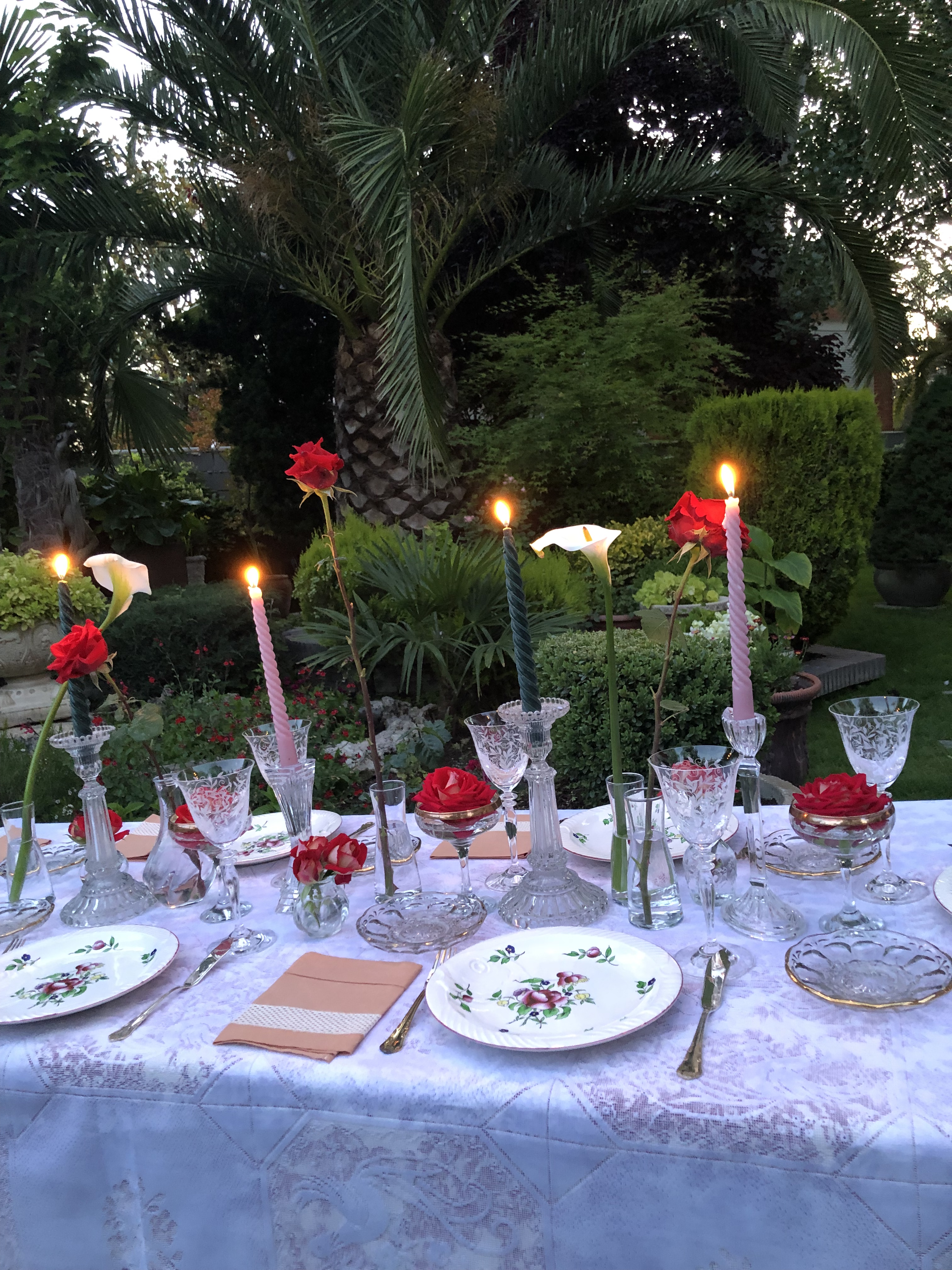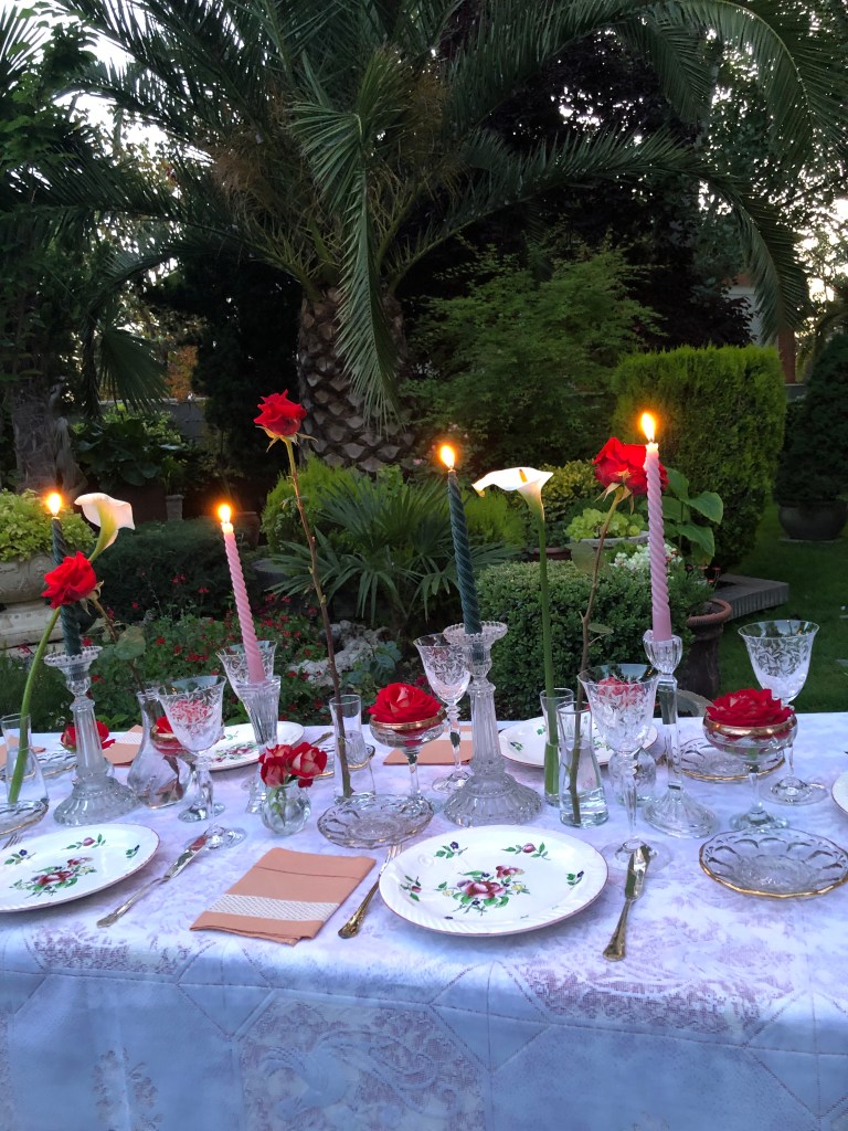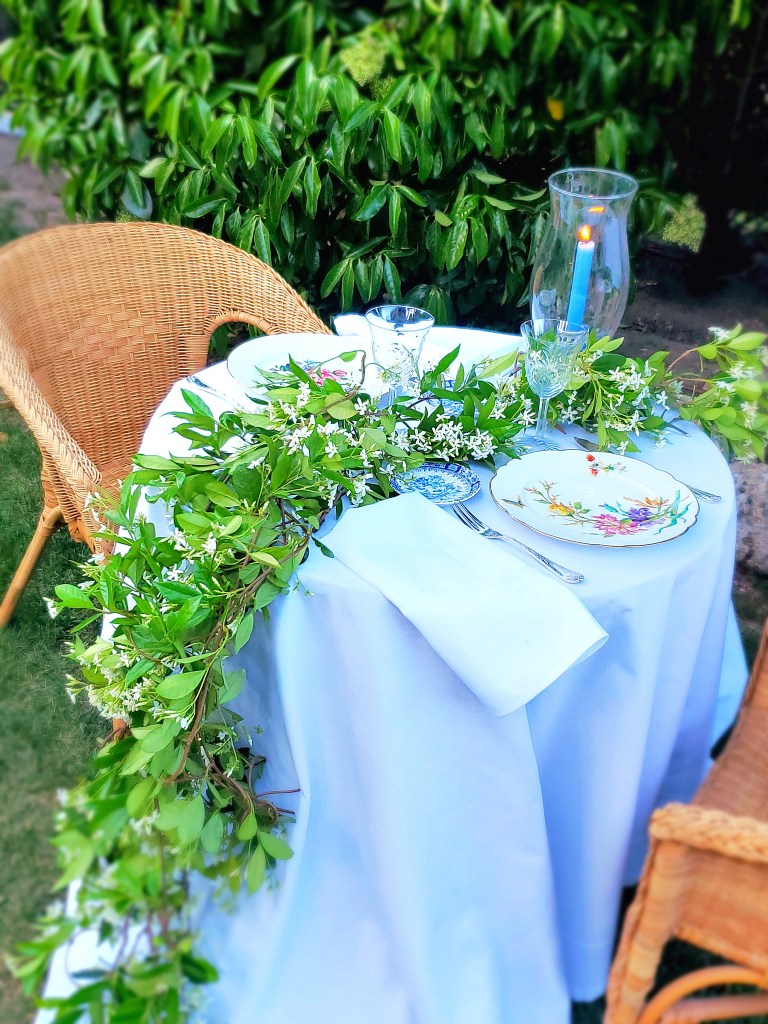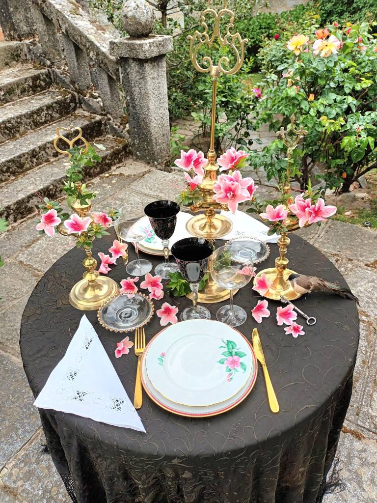 Colocaría unas servilletas traídas de la mansión, bordadas por la Sra. Craven en sus ratos libres, platos con flores, acordes a las que habían en el Jardín, imaginando bellísimas flores de azaleas como antaño habrían, y candelabros en forma de lámpara de Aladino, que también decoraría con flores, como así lo haría la Sra. Craven en la época en la que el jardín mostraba toda su hermosura y esplendor.