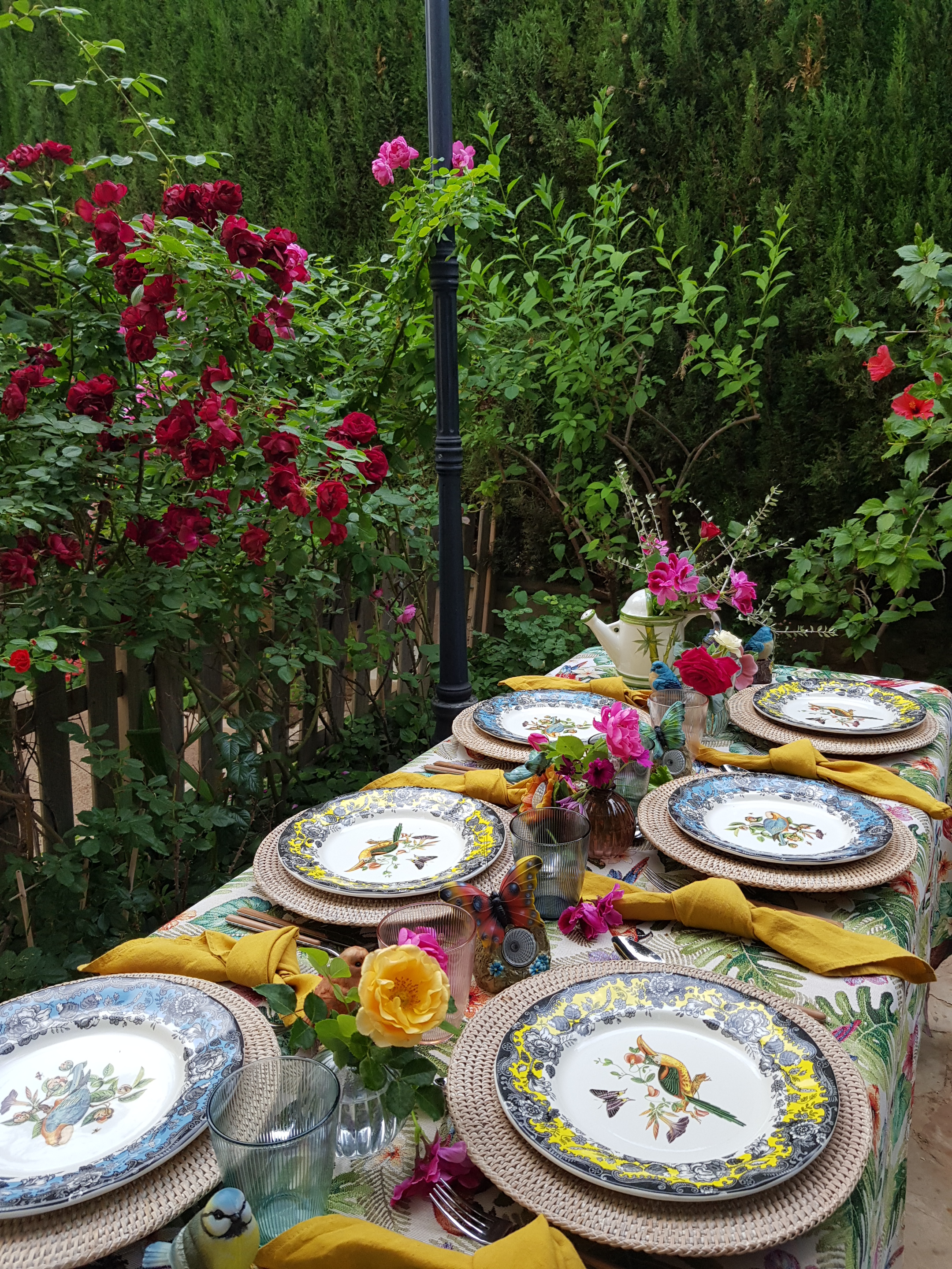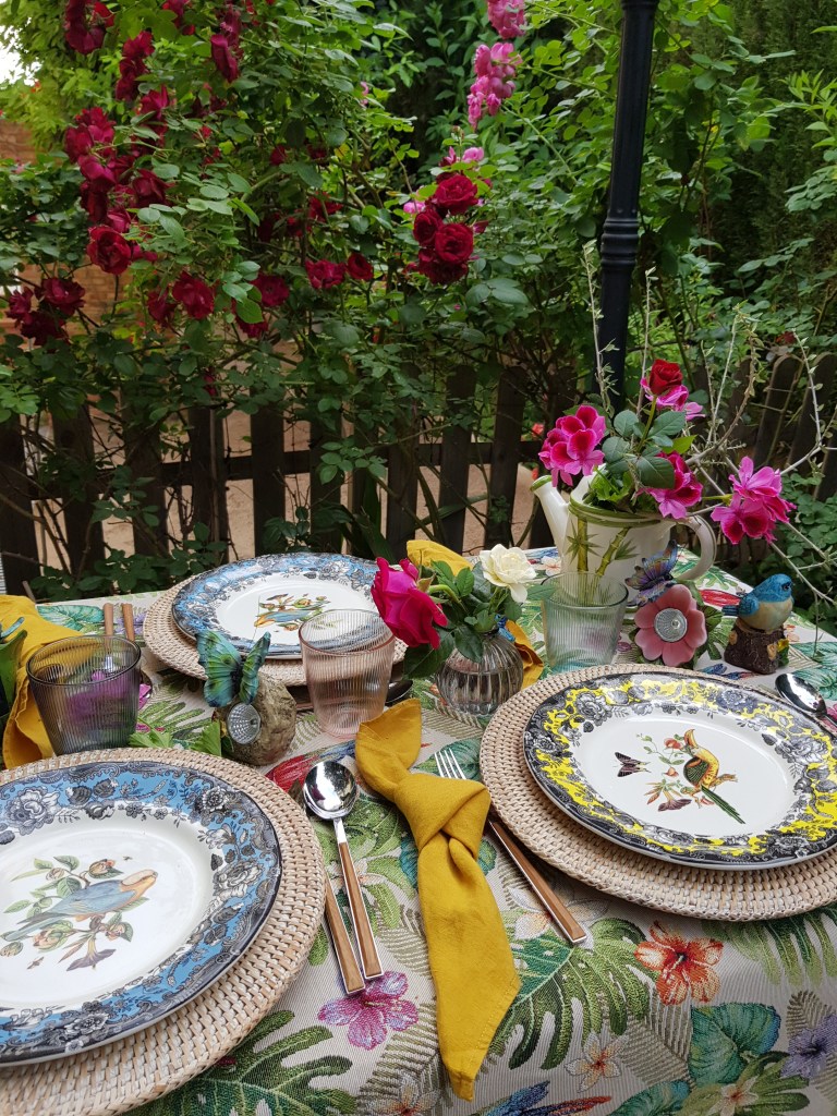 Y su sueño terminó siendo realidad, como vemos en esta exótica y delicada mesa para disfrutar en un exótico jardín, mientras se va sintiendo el suave viento en las mejillas, el aroma de la tierra mojada, o la bella sinfonía del canto de su amigo el petirrojo.