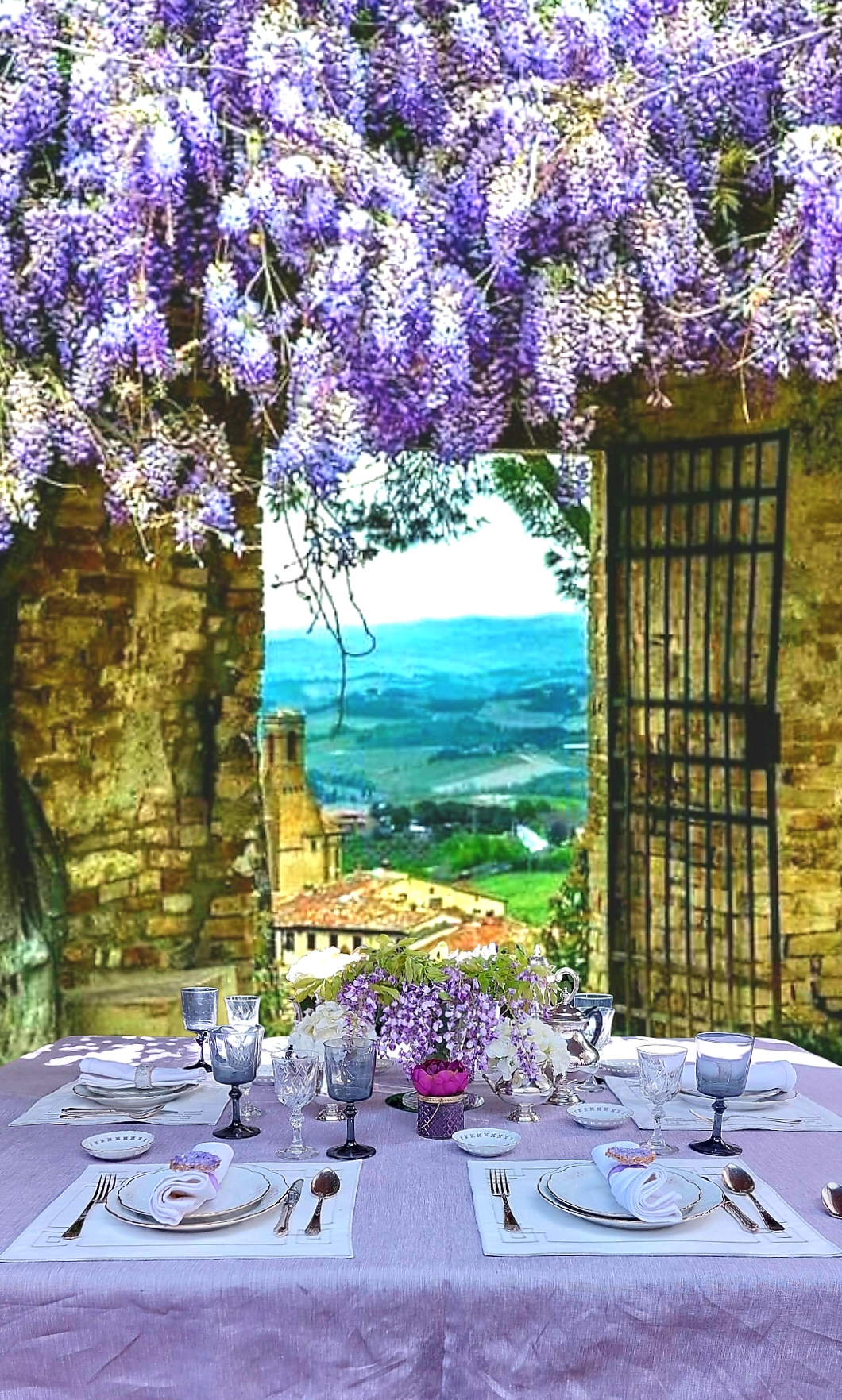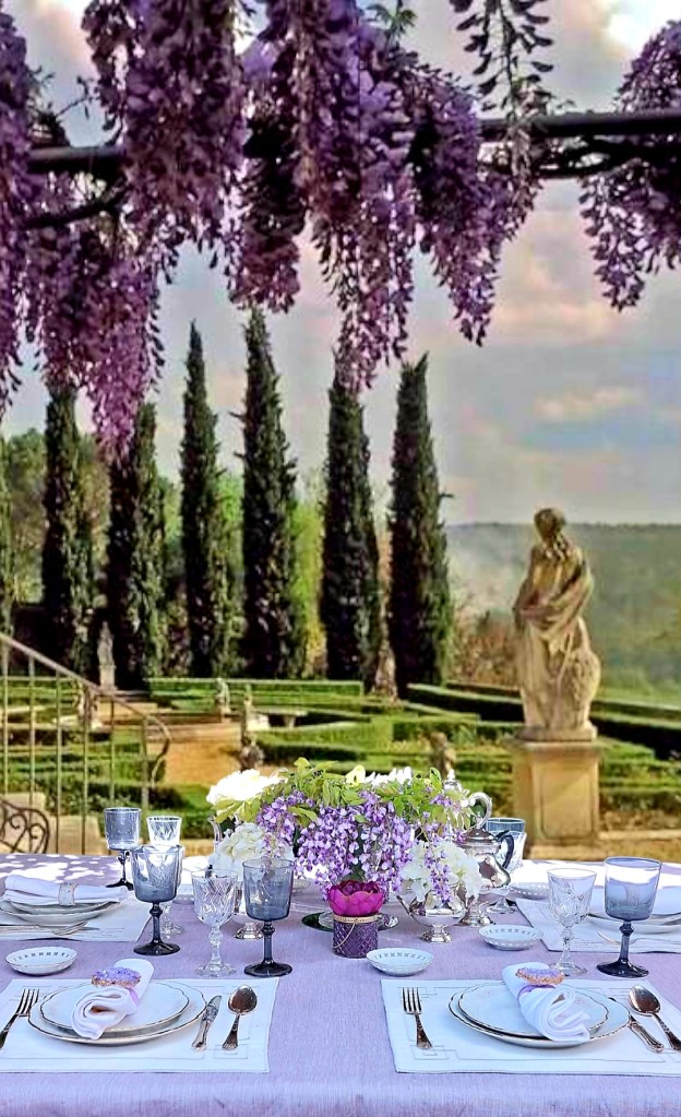 Marta elije un lugar del jardín, dónde un dosel de delicadas glicinias proporciona un toque de esplendor a su delicada mesa.