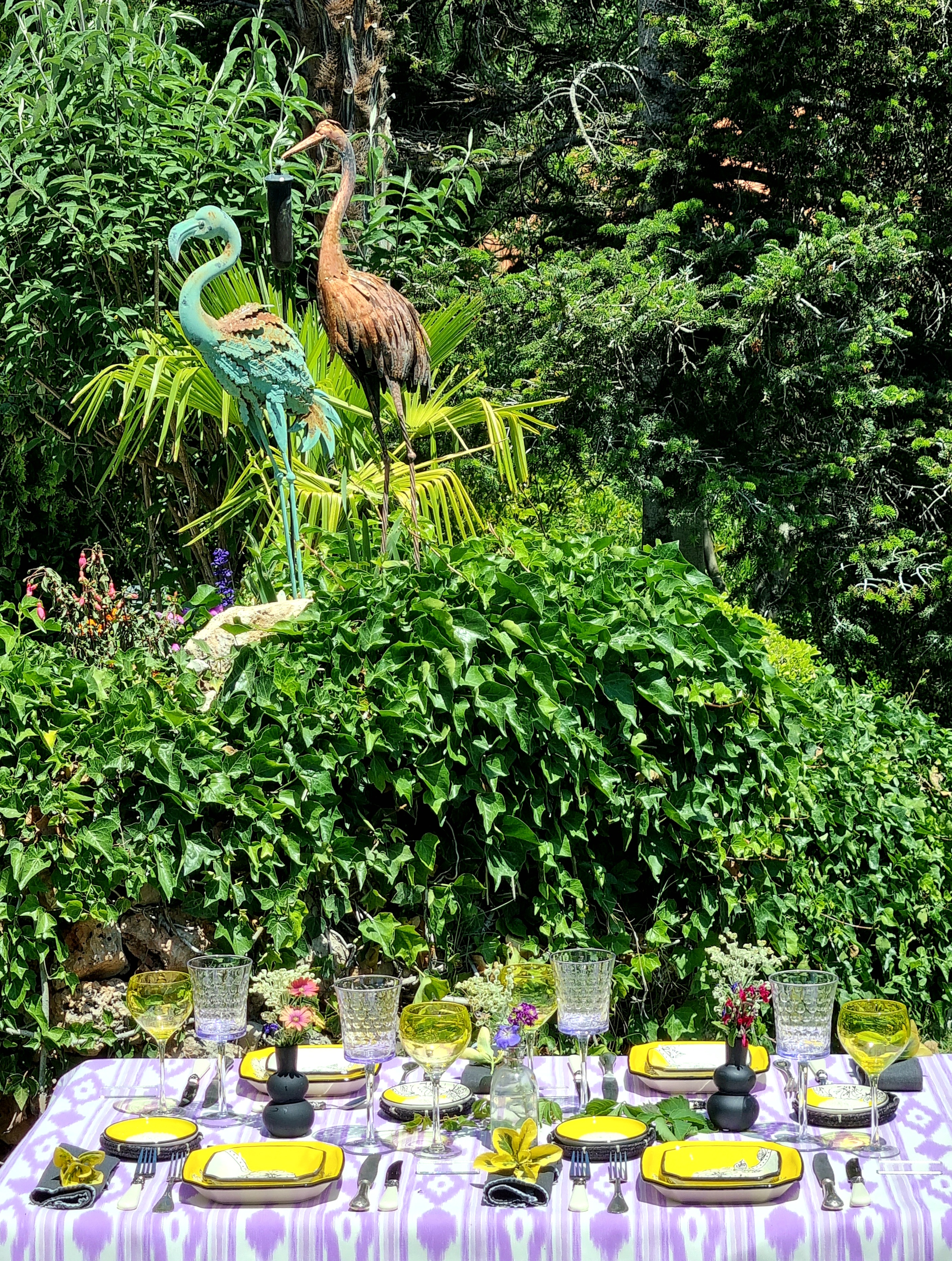 Sueña con una mesa en un extraordinario espacio, de gran diversidad de delicadas flores, olorosas y exóticas, con unos estilizados y elegantes flamencos y unas majestuosas y esbeltas garzas paseándose por doquier.