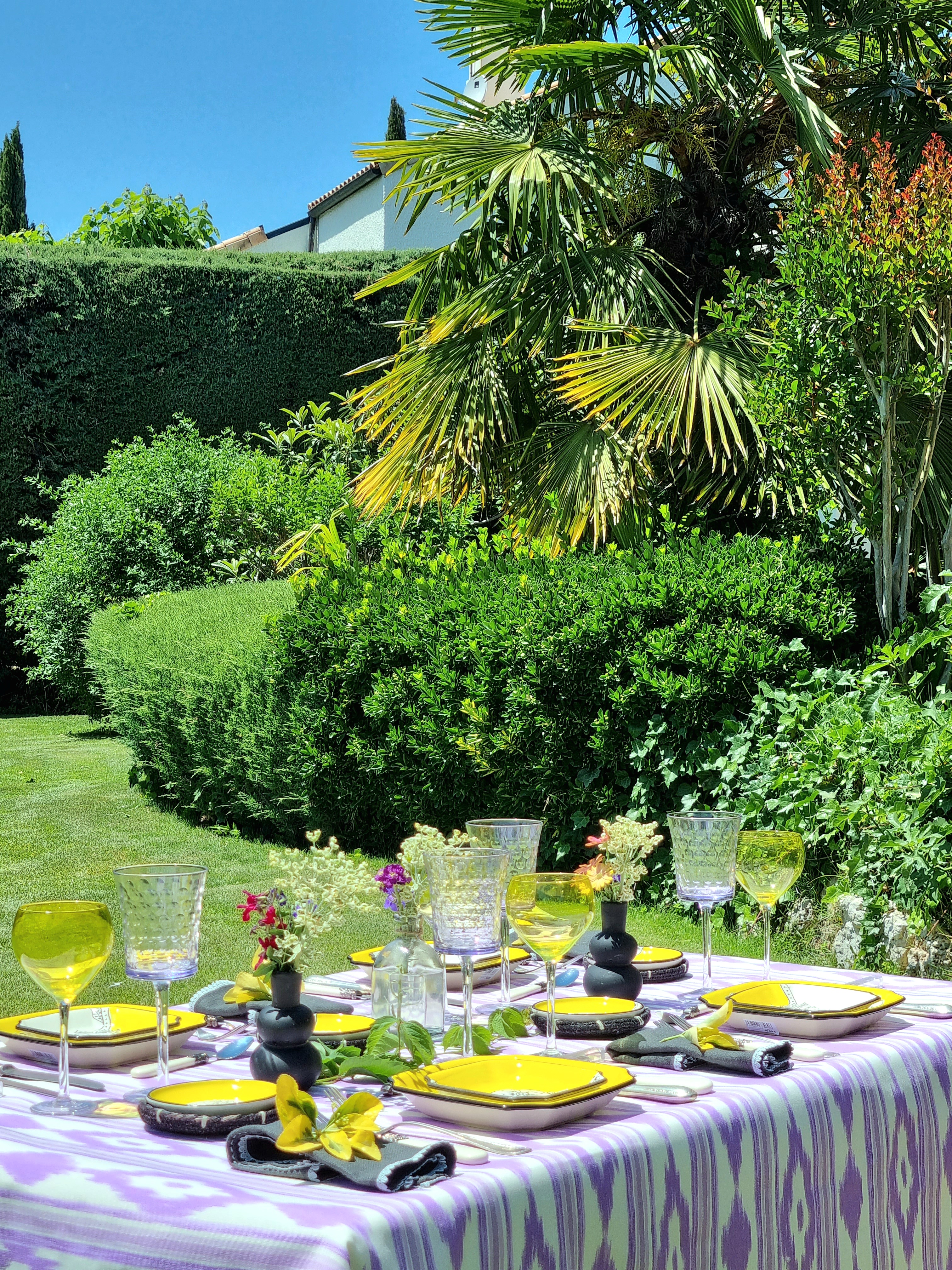 Ana imagina una mesa con mantel de tela de lengua mallorquina de color lila. Colocaría unas servilletas en gris oscuro como las que la Sra. Craven guardaba en un cajón de la alacena en la Mansión, y que le darían ese magnífico contraste con los platos tan originales, de forma cuadrada y de color amarillo.