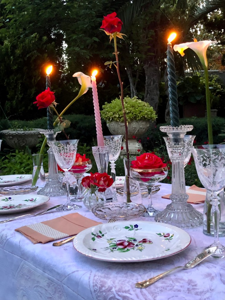 Soñaba con un maravilloso mantel de encaje blanco, sobre tejido de toile de jouy, y que acompañaría con platos antiguos de Boch que tuvieran de relieve un pez. Cubertería de plata y copas de Bohemia y, como centro de mesa, unas rosas y calas recién cortadas, como a la Sra. Craven le gustaba hacer. Unas velas para iluminar la noche, cuya magia se hacía más patente, entre tanta dulzura y calidez.