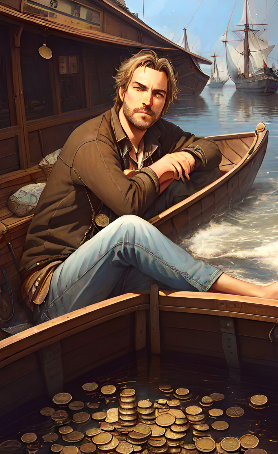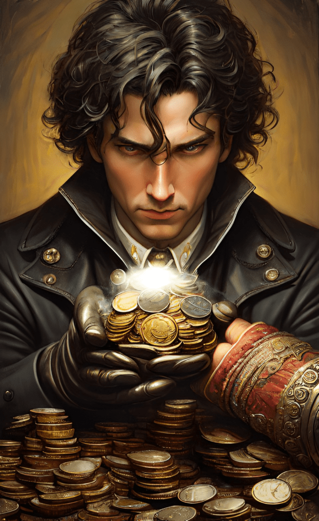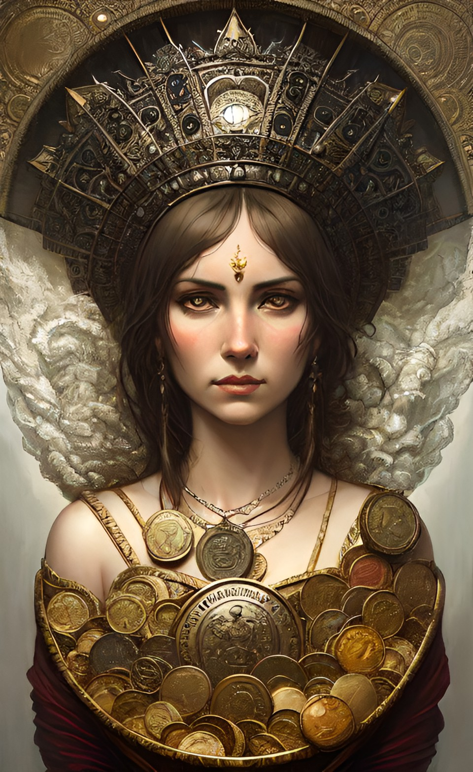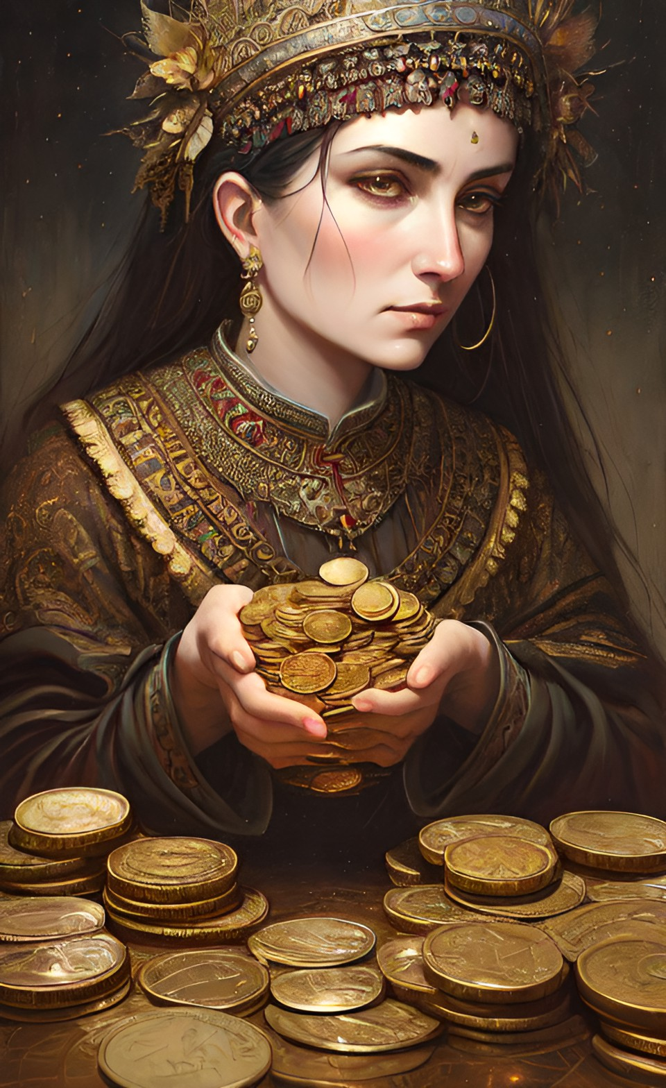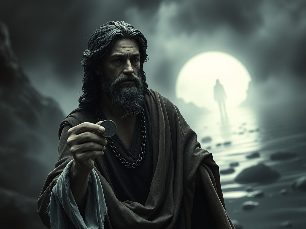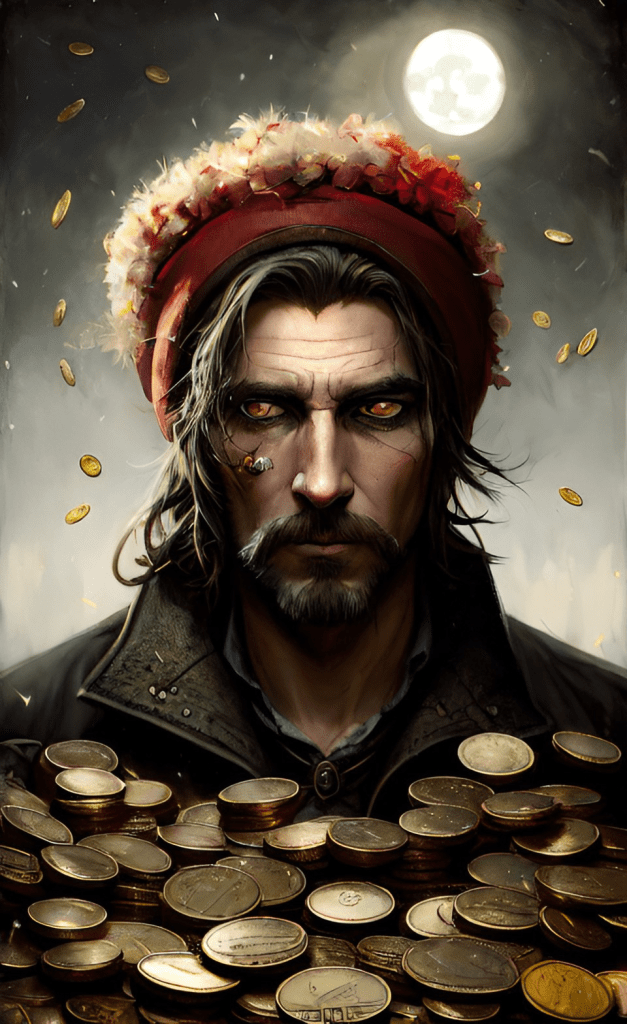 Caronte, el barquero que, en la tradición clásica, recibe dos monedas (colocadas sendas en cada ojo del difunto o difunta) y que acumula grandes cantidades de dinero por trasladar a los muertos en su último destino final hacia la muerte.