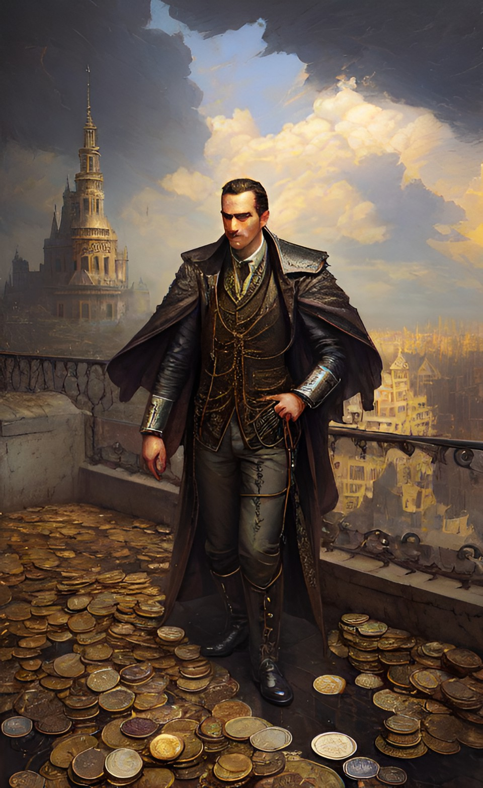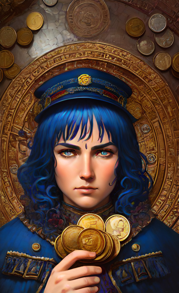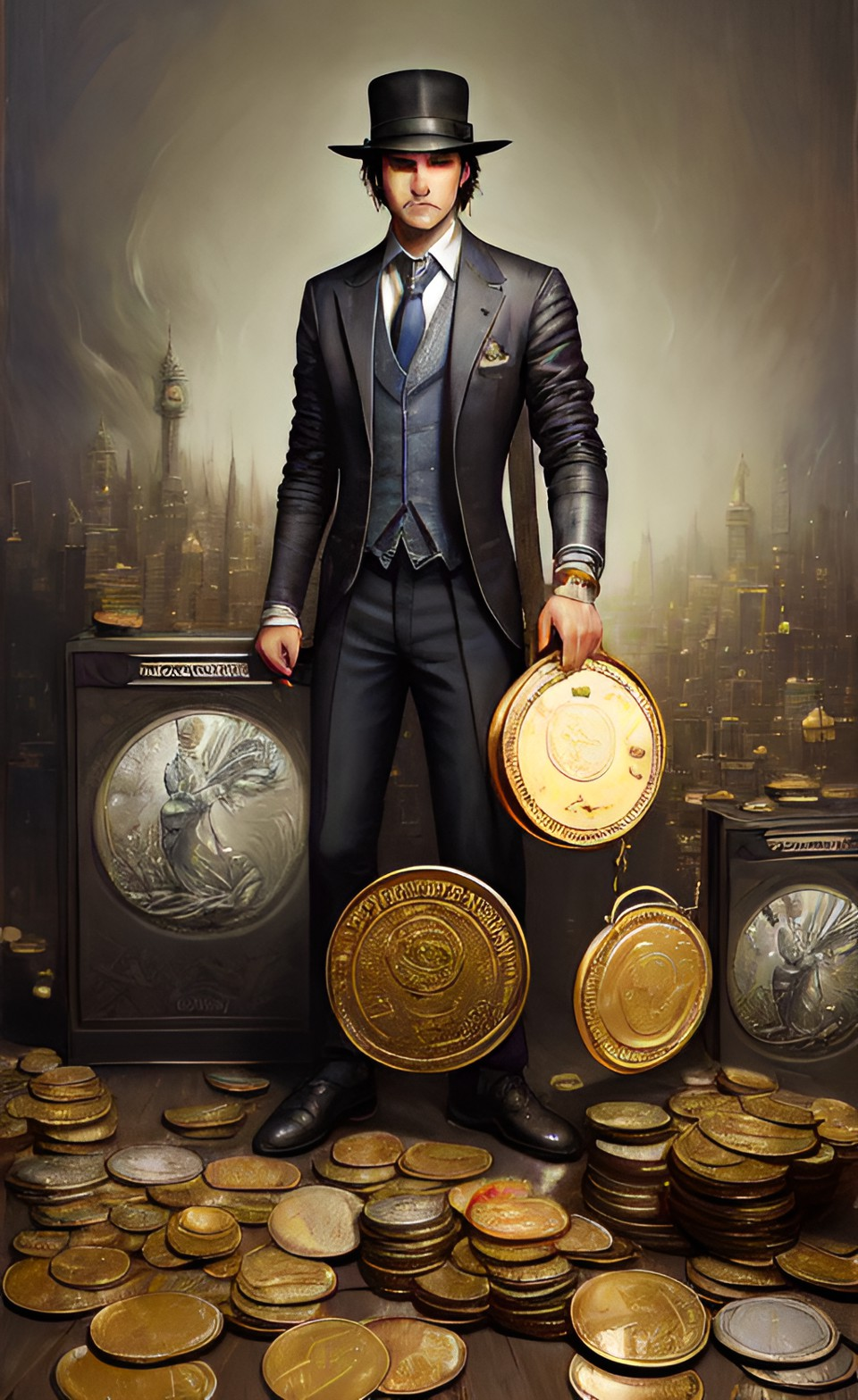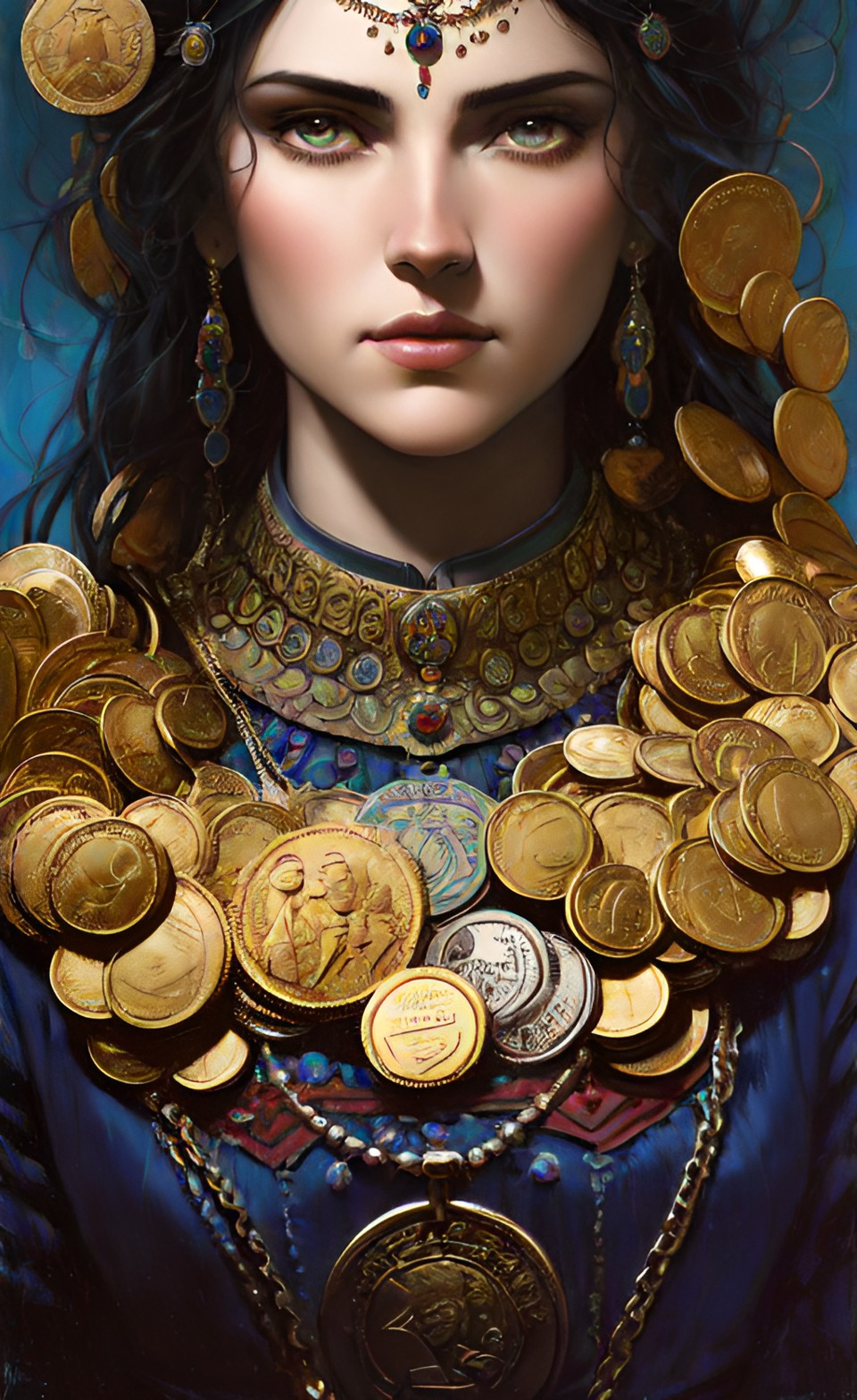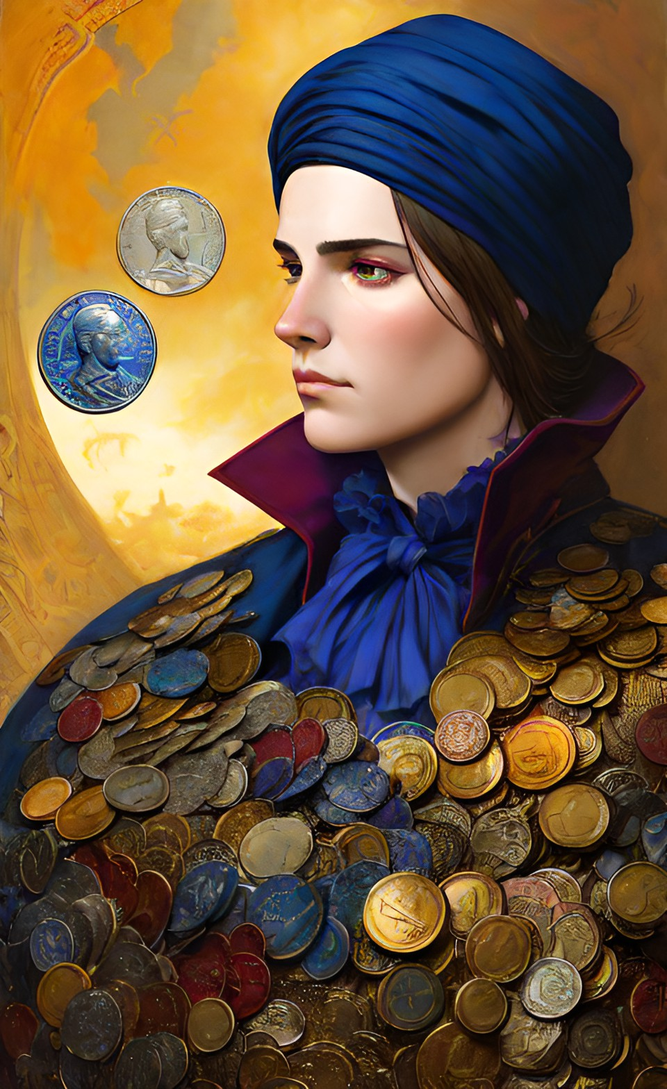 Caronte, el barquero que, en la tradición clásica, recibe dos monedas (colocadas sendas en cada ojo del difunto o difunta) y que acumula grandes cantidades de dinero por trasladar a los muertos en su último destino final hacia la muerte.
