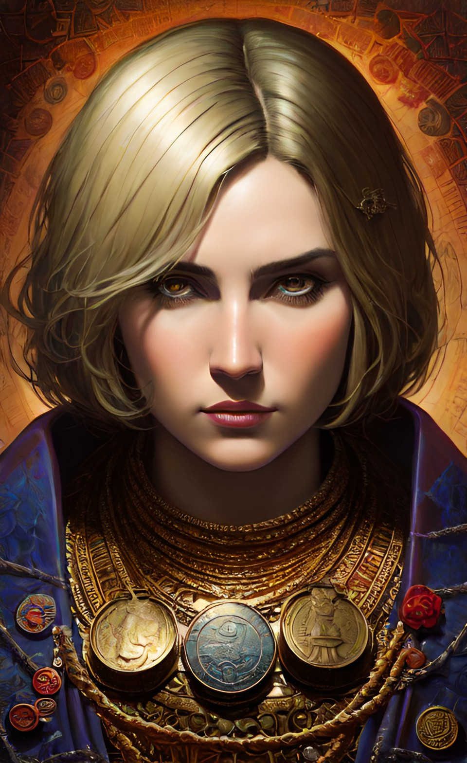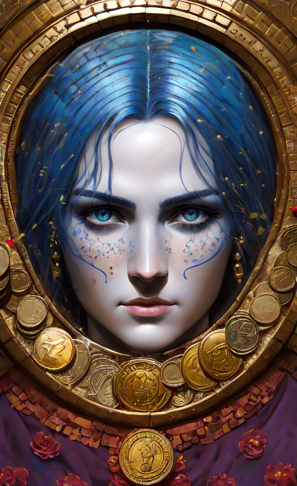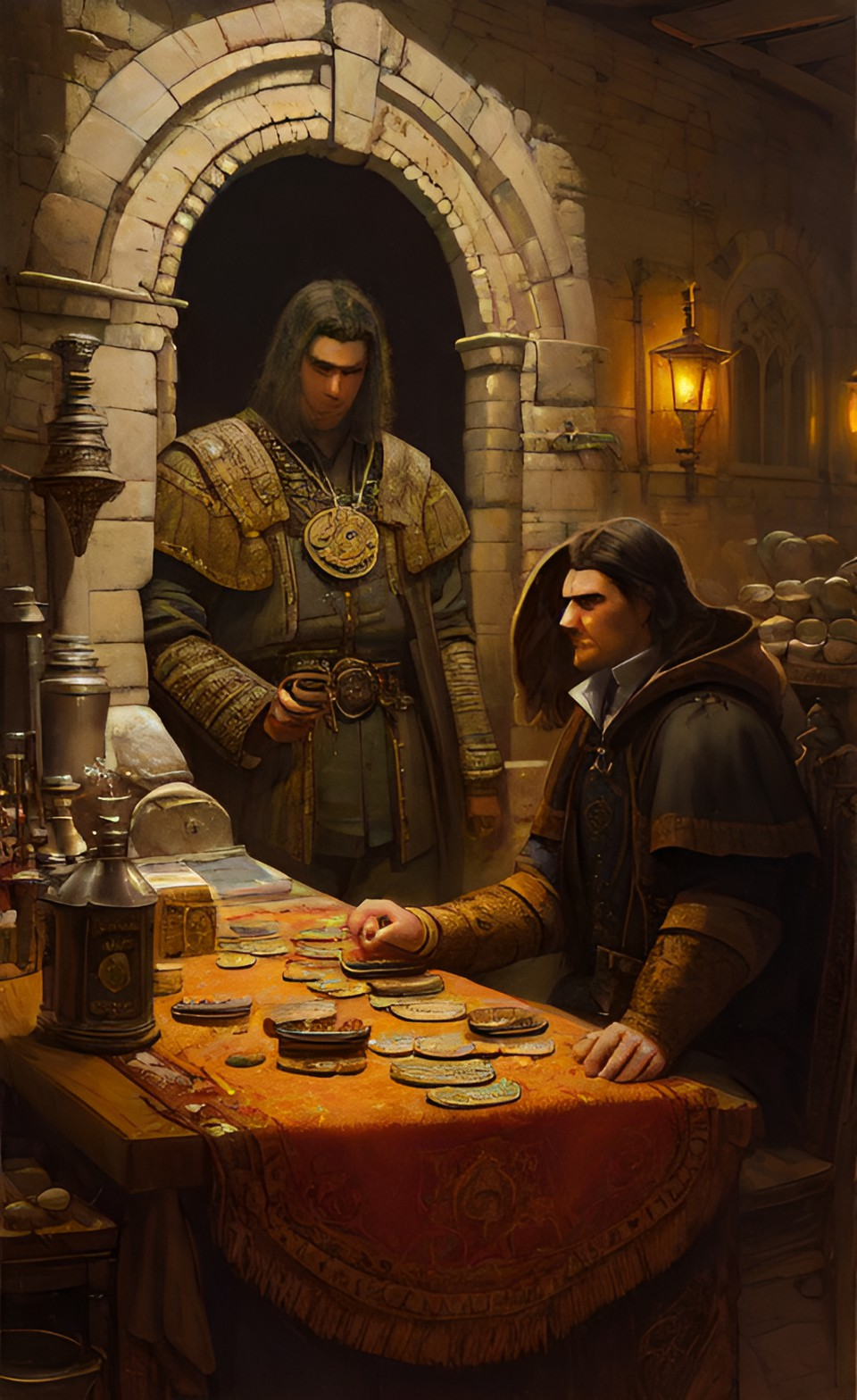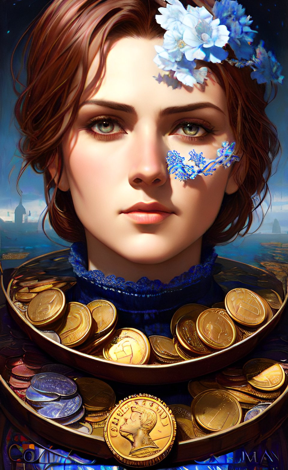 Caronte, el barquero que, en la tradición clásica, recibe dos monedas (colocadas sendas en cada ojo del difunto o difunta) y que acumula grandes cantidades de dinero por trasladar a los muertos en su último destino final hacia la muerte.