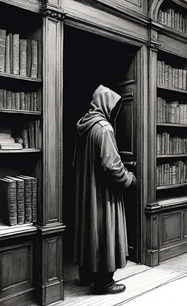 Intentó abrir la puerta de la biblioteca, pero esta se encontraba cerrada, y al forzarla, se dio cuenta de que no cedería. Mientras observaba la habitación en busca de alguna salida alternativa, oyó pasos en el corredor, pasos lentos y pesados que resonaban en las paredes de piedra. Liz se agachó y tomó la postura de antes de incorporarse, miró por la rendija de la puerta, esperando ver al guardia del castillo, pero lo que vio la dejó sin aliento: una figura encapuchada, similar a la que había visto en la cripta de la catedral: caminaba por el pasillo, y se detuvo frente a la puerta de la biblioteca.