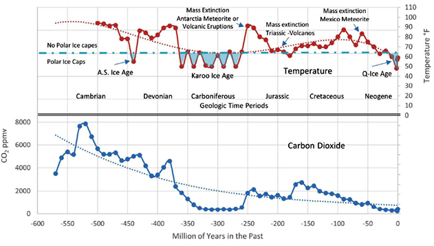 Por otra parte, la evolución del CO2 en la atmósfera no tiene nada que ver con la evolución de la temperatura. Así, hace unos 250 millones de años, al final del carbonífero y durante el Pérmico, con un porcentaje de CO2 en la atmósfera idéntico al actual, hubo una glaciación intensa que afectó a todo el Planeta, con temperaturas varios grados por debajo de las actuales. ¿Responde esto a la pregunta que me has hecho?
