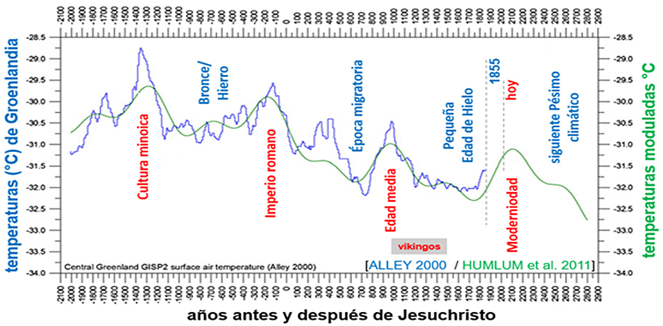 J.A. —Continuando con esta visión geológica, debe destacarse que los catastrofistas del clima concentran toda su atención en lo ocurrido durante los dos últimos siglos, ignorando incluso lo que ha pasado en el conjunto del periodo histórico de la humanidad. Es como si pretendiésemos interpretar la actualidad de nuestra sociedad, lo que está ocurriendo hoy, tan sólo con la información publicada en los periódicos de ayer, ignorando los conocimientos acumulados por la humanidad desde sus principios, almacenados en bibliotecas. Por eso, hemos titulado así nuestro libro, escrito en colaboración con Stefan Uhlig, un geólogo alemán, Cambios Climáticos, en plural, porque la evolución de clima de la Tierra es el resultado de la superposición de múltiples ciclos de diversa duración, y lo que nunca ha existido es la estabilidad climática. Los datos históricos así lo atestiguan. Tan sólo durante los últimos dos mil años han existido dos periodos con temperaturas medias varios grados más cálidas que las actuales, como fueron el máximo térmico durante el Imperio Romano y el de la Edad media, coincidiendo con la expansión vikinga que llegó hasta Groenlandia e incluso América del Norte. Posteriormente, ha llegado el máximo actual, y de acuerdo con las predicciones de Milankovitch, dentro de varios cientos de años, se iniciará un nuevo descenso térmico hacia un periodo frío. ¿Es así, cuál es tu opinión?