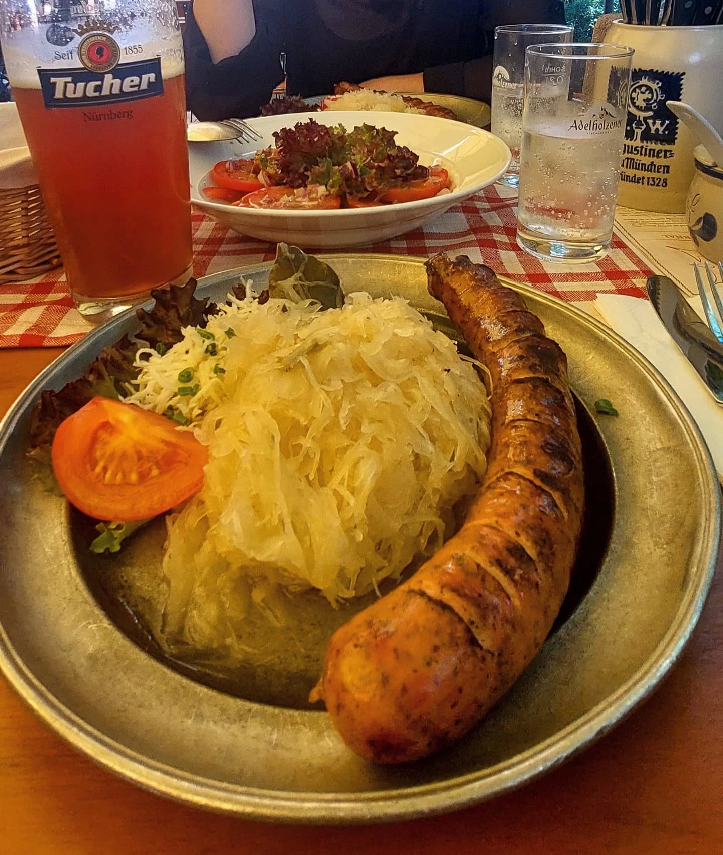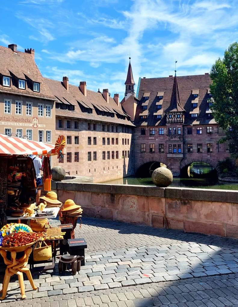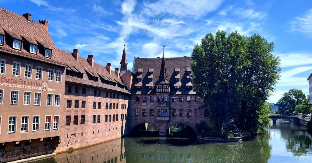 El Hospital del Espíritu Santo (Heilig-Geist-Spital) fue el hospicio más grande de la antigua Ciudad Imperial Libre de Núremberg. También fue el lugar donde se custodiaban las joyas del Sacro Imperio Romano Germánico (estuvieron aquí desde 1424 hasta 1796). El hospital se construyó en gran parte sobre el río Pegnitz a mediados del siglo XIV y fue remodelado tras la Segunda Guerra Mundial como restaurante típico y residencia. Muy ricas las salchichas nuremburguesas con chucrut (servidas en plato de latón con forma de corazón, como manda la tradición) y estupendo el apfelstrudel acompañado de un Asbach (el brandy bávaro).
