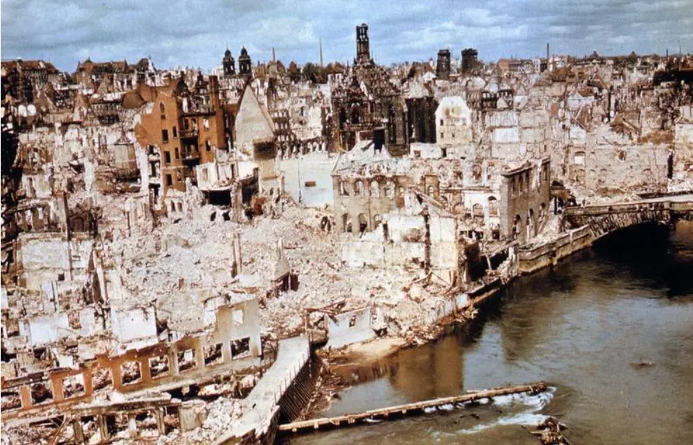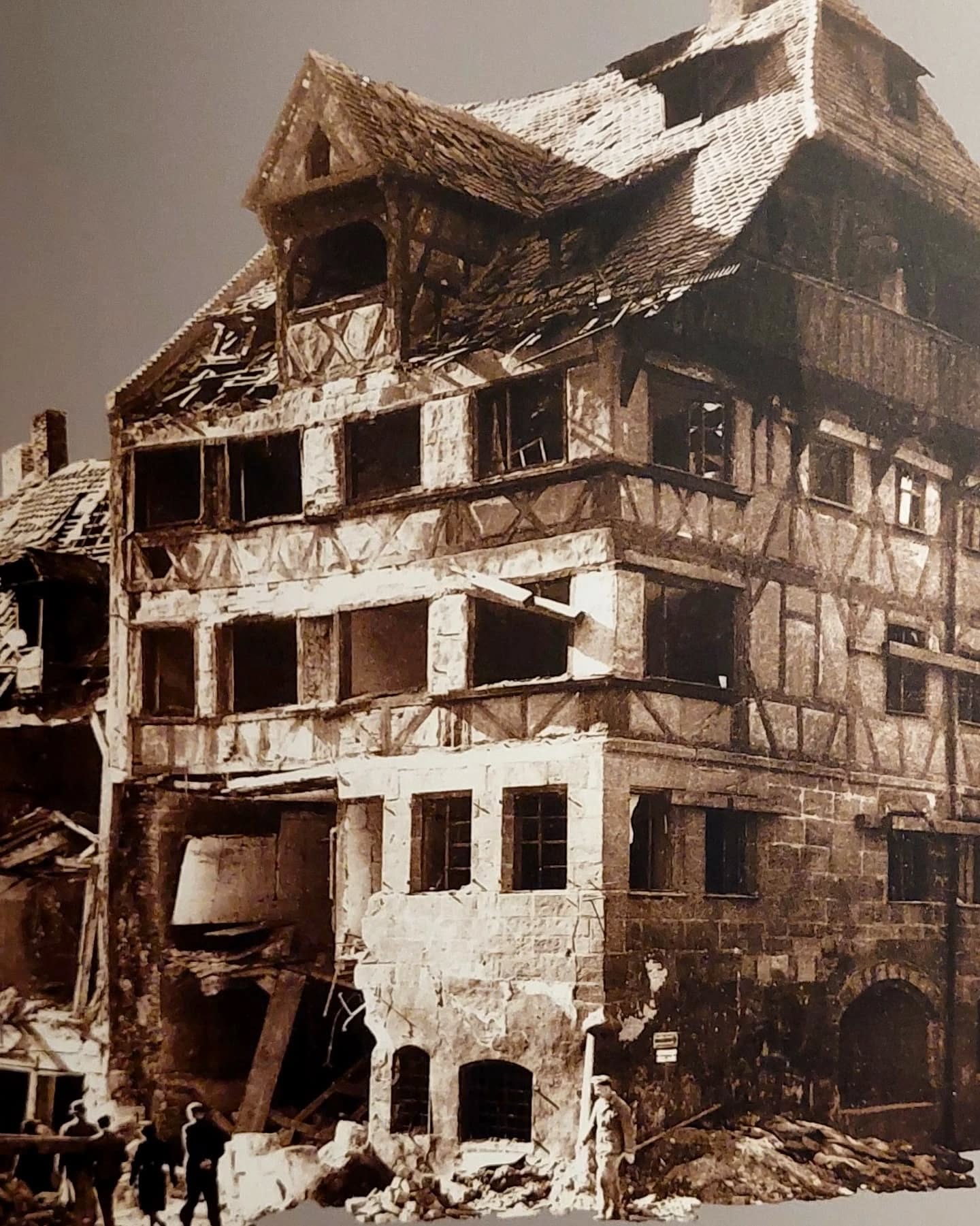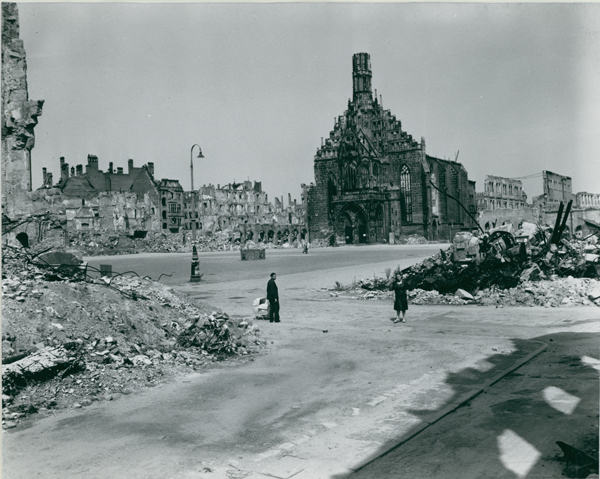La noche del 2 de enero de 1945 una incursión aérea de la RAF dejó caer sobre Núremberg cerca de 6.000 bombas incendiarias que devoraron más del 90% del casco histórico. Resultado: miles de víctimas y uno de los campos de escombros más notables de toda la Segunda Guerra Mundial (un desastre equiparable a los sufridos en Varsovia, Dresde o Rotterdam). Así quedó el centro histórico: