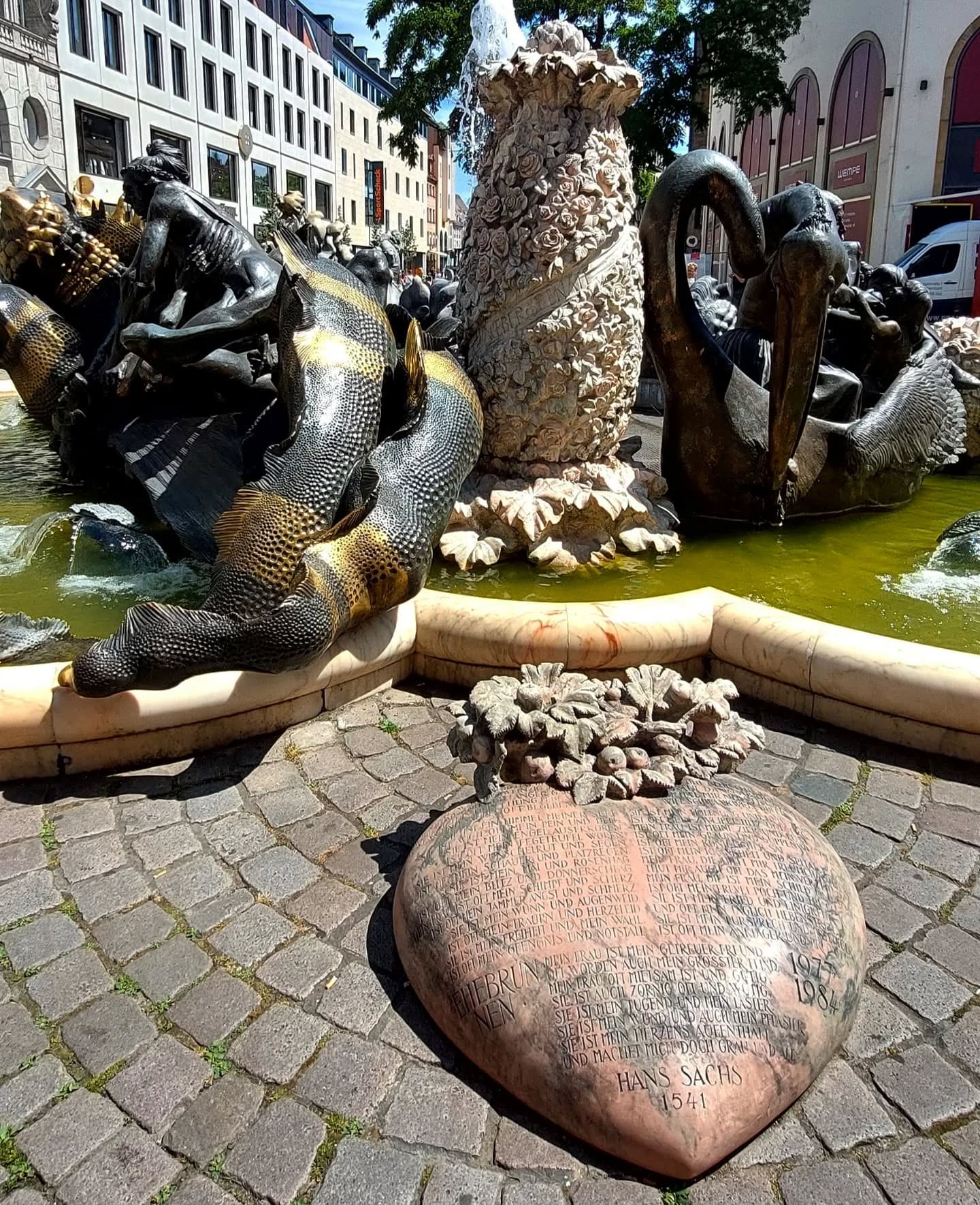 El corazón de mármol frente a la estación contiene grabado el poema original de Hans Sachs, la pila de su base recicla el agua de la ventilación del metro y las seis escenas, hechas de bronce dorado al fuego, representan las etapas del ciclo conyugal, desde el encantamiento amoroso hasta la muerte. Todo un ejemplo de sensualismo pseudobarroco que no te puedes perder paseando por este animado espacio peatonal repleto de tiendas, terrazas y patrimonio artístico e histórico (la Torre Blanca se corresponde con una de las puertas de la muralla del siglo XIV).