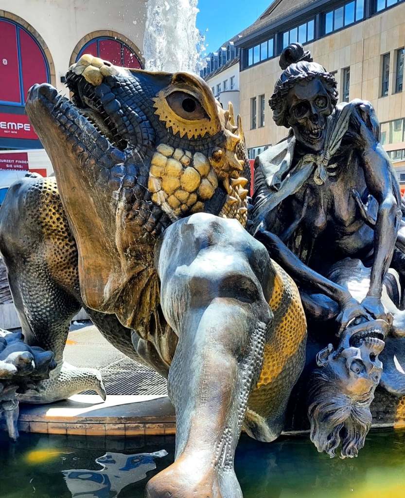 Para tapar la ventilación de la estación del metro de la Torre Blanca (Weisser Turm), en 1984 se adjudicó el proyecto al escultor Jürgen Weber quien, inspirándose muy libremente en el poema Das bittersüße eh’lich’ Leben de Hans Sachs, diseñó esta polémica fuente que no deja a nadie indiferente cuando pasas por su lado y te entretienes en sus curiosas escenas…