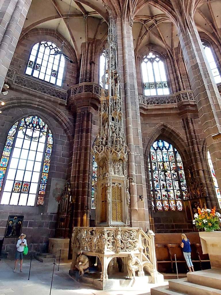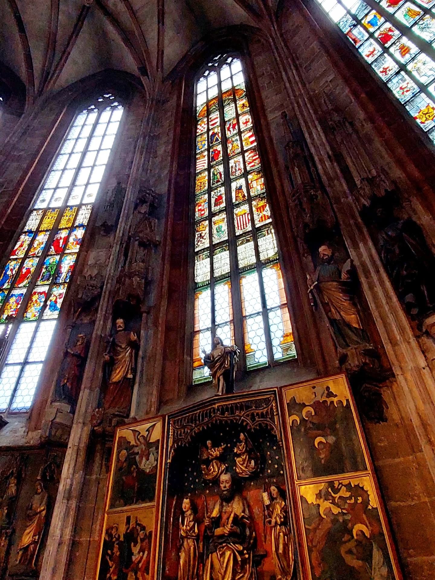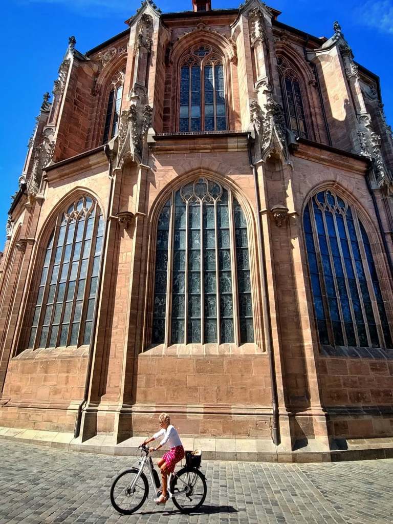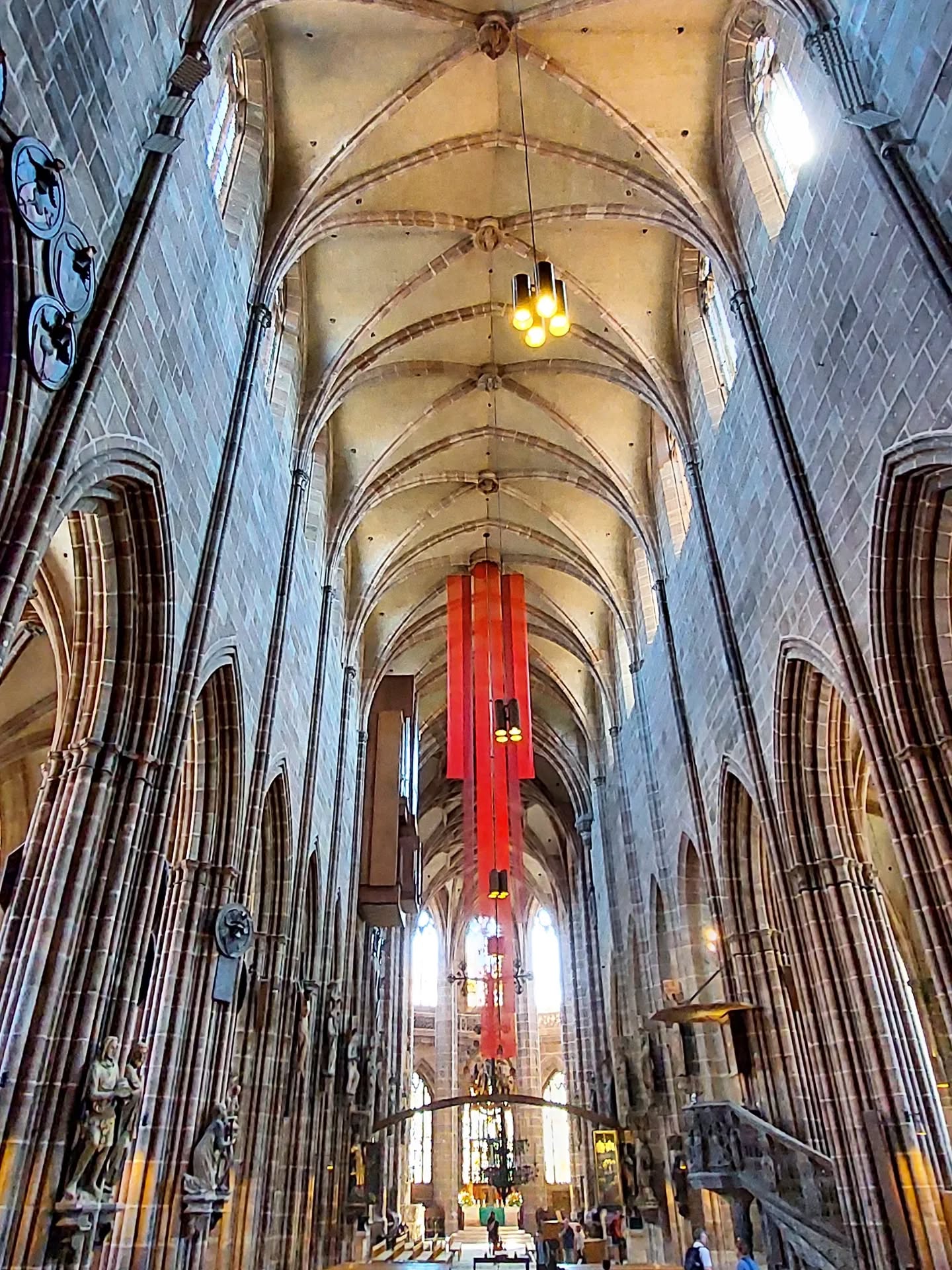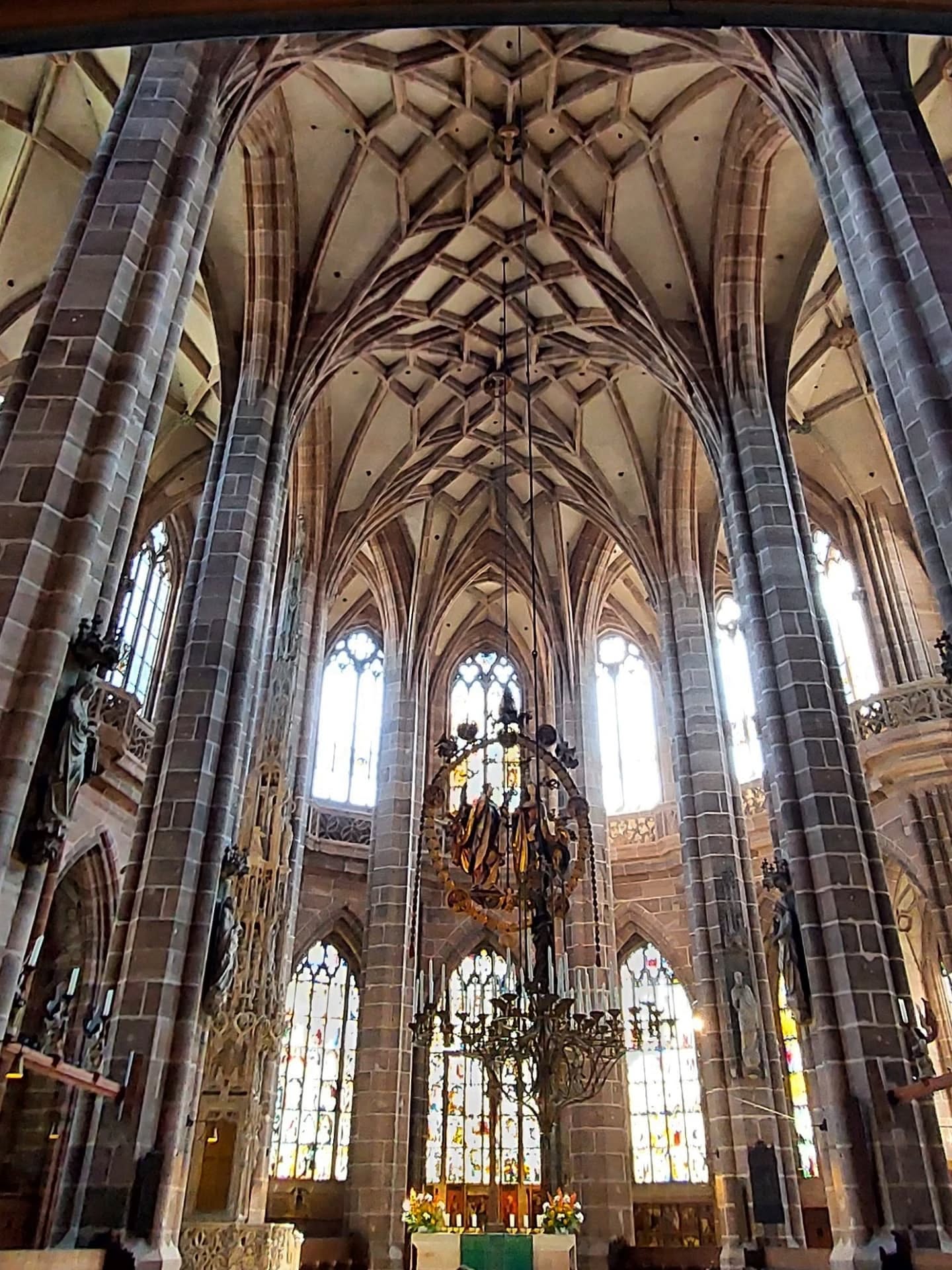 Luminosa y espaciosa en su interior gracias a sus grandes vidrieras, destaca en el Coro el imponente sagrario de Adam Krafft (1490), una creación fantástica que se eleva hasta el crucero del ábside (y donde el mismo artista se representó en su base). Elementos góticos y renacentistas, como la escalinata del órgano, se funden en este bonito edificio que fue muy dañado en enero de 1945 y que fue reconstruido tal cual era en su momento de esplendor.