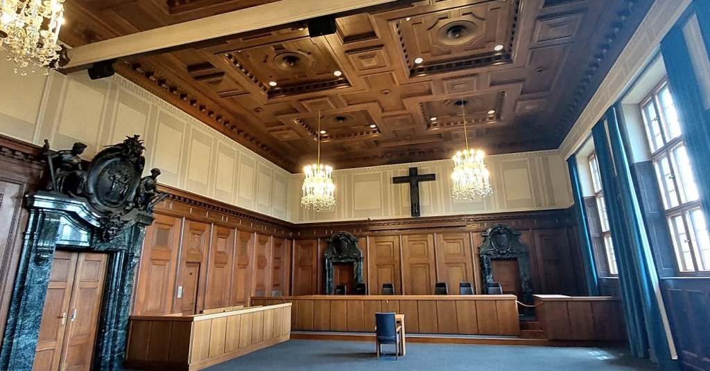 En la Fürtherstrasse, la gran avenida que une la ciudad con la vecina Fürth, se construyó el Palacio de Justicia de la ciudad a finales del siglo XIX. Concluida la guerra, las naciones aliadas eligieron la simbólica Núremberg para llevar a cabo el juicio sumarísimo a los cautivos nazis de mayor rango, 24 altos cargos e industriales prominentes del Tercer Reich, aprovechando que el gran Justizpalast había sufrido pocos daños durante los bombardeos. El lugar elegido para tan trascendental juicio fue la Sala 600, que hoy podemos visitar en la segunda planta del Memorium (Museo de los Juicios de Núremberg), sentarnos en las que fueron banquetas de prensa y hacernos a la idea de cómo era todo aquello entre noviembre de 1945 y octubre de 1946, fecha en la que concluyó el llamado Proceso de Núremberg.