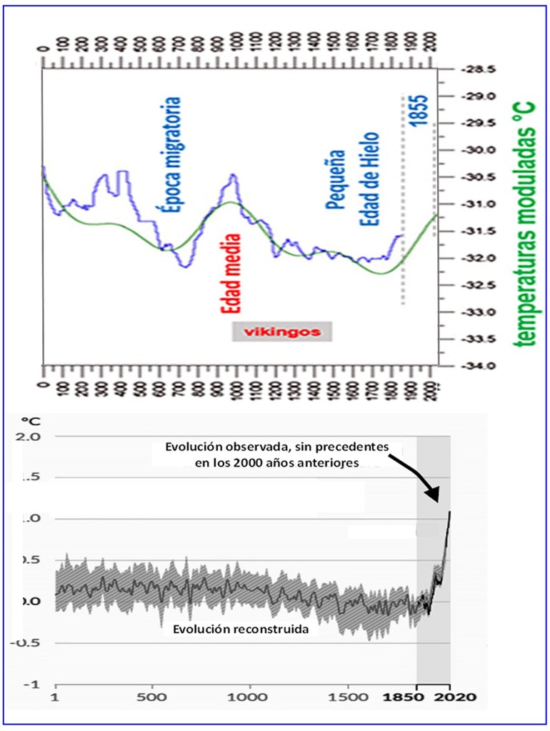 A pesar de estas evidencias, el relato climático oficial se mantiene inmutable, apoyándose en datos climáticos manipulados que han sido objeto de numerosas críticas por parte de prestigiosos científicos. Tal y como puede apreciarse en la Figura 2, la gráfica superior corresponde a los últimos 2.000 años de la misma gráfica ya representada en la Figura 1, mientras que la gráfica inferior corresponde a la evolución de la temperatura para ese mismo periodo, estadísticamente reconstruida por el Grupo de Estudio del Cambio Climático de Naciones Unidas (IPCC). Como puede apreciarse, en la gráfica inferior (conocida por su forma como palo de hockey), mediante la aplicación de tratamientos estadísticos sesgados, han desaparecido las oscilaciones de temperatura registradas a lo largo del tiempo, resaltando así de forma falsaria el calentamiento actual, haciéndolo aparecer como anómalo y excepcional. Sin embargo, son innumerables los datos históricos y los hallazgos recientes que demuestran la falta de representatividad de la gráfica elaborada por el IPCC y que confirman la validez de la gráfica superior de la Figura 2.